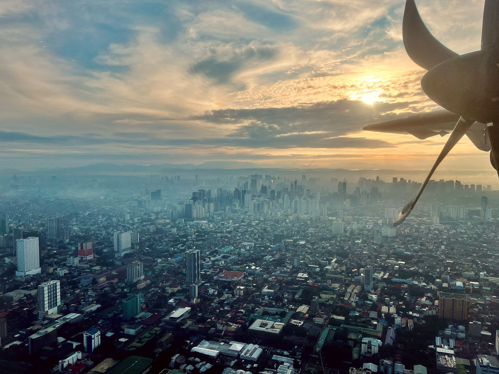 Heute Morgen um 4:30 ging’s dann schon wieder los auf den Domestic Airport. Dort war alles unglaublich sauber und super schnell in der Abwicklung! Außerdem standen da mehr Bedienstete als Fluggäste, was an der Uhrzeit gelegen haben mag. Bei einem schönen Sonnenaufgang sind wir dann mit einer kleinen Propeller-Maschine in Richtung El Nido auf die Insel Palawan gestartet und konnten ein paar tolle Aussichten auf die Millionenstadt Manila erhaschen.