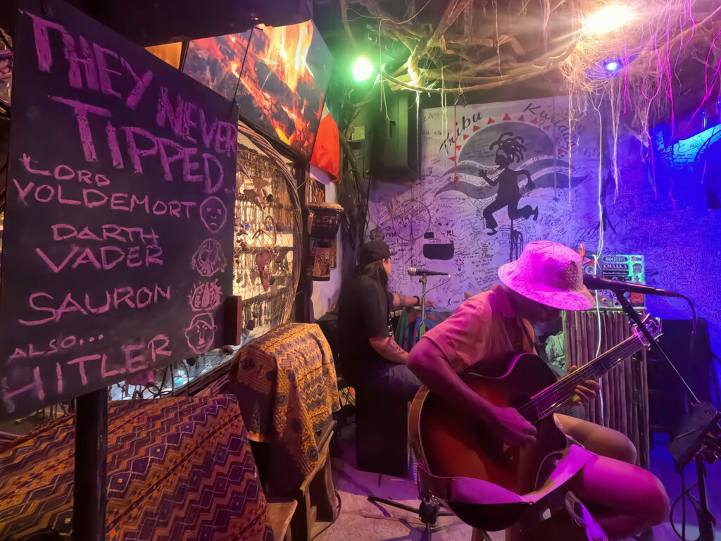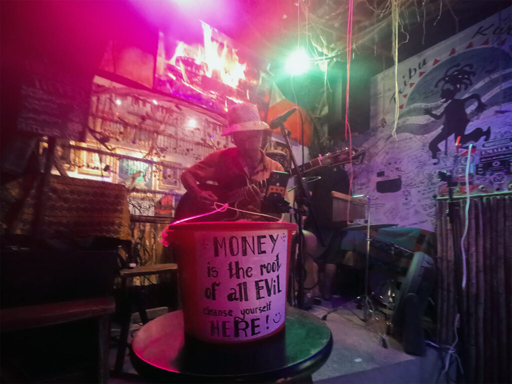 Auf dem Rückweg am Strand entlang, haben wir eine sympathische kleine Strandbar entdeckt. Dort gab es Live-Musik mit Gitarre und Cajon. Super Sound, mega gut abgemischt und aus den alten Kübeln kam wirklich einer der besten Live-Sounds, die ich an so einer Strandbar ever gehört habe! Als einizige Gäste haben wir dann sozusagen ein Privatkonzert bekommen. Leider hatten wir nur noch 200 Pesos dabei, was so ungefähr 3 Euro sind. Wir haben also das billigste getrunken, was wir bekommen konnten: 2 Jacky Cola! Das war ernsthaft günstiger als Wasser oder Kaffee…