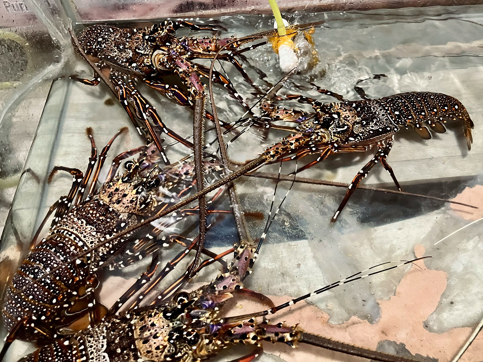 Am Vortag haben wir einen Insider-Tipp fürs Abendessen bekommen. Direkt am Strand in El Nido liegt ein von außen recht unscheinbares Fischrestaurant names Angel Wish. In Badeklamotten und Rollerhelm-Plattdatsch-Frisur (also ich, beides) sind wir auf dem Rückweg spontan dort vorbei. Das Essen war wirklich super lecker! Vor dem Restaurant lagen auf Eis die noch lebenden, oder frischen – ganz wie man es halten mag – Krebse, Hummer und sonstiges Meeresgetier.