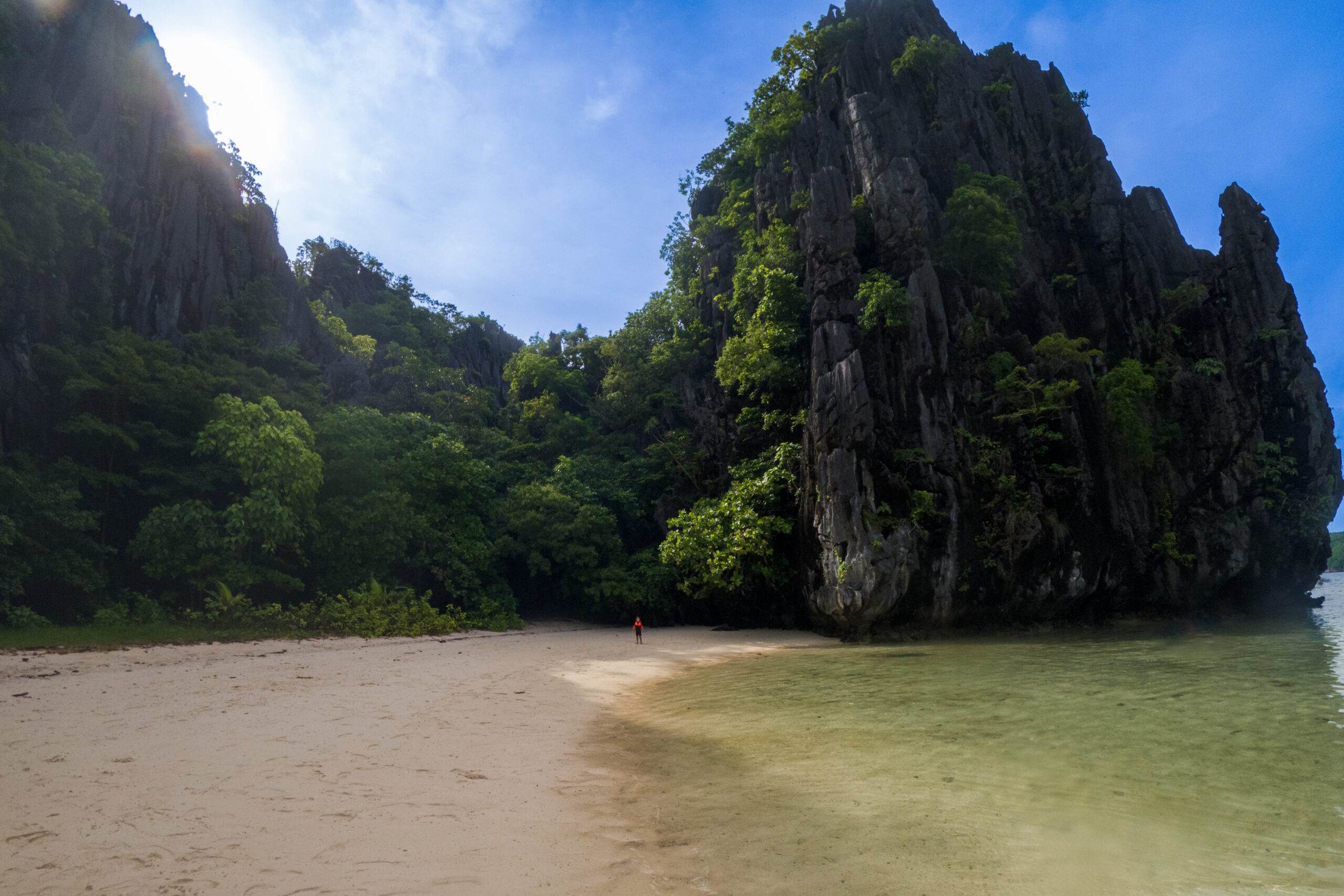 Wir waren grad durch eine Höhle gekrabbelt – Maila ganz ohne Scheu vorneweg – und haben nach ca. 100m durch das seichte Wasser wadend, den wirklich tollen kleinen Sandstrand im Inneren entdeckt. Das ist mal wirklich schön versteckt und kommt völlig unerwartet um die Ecke! Wirklich toll!