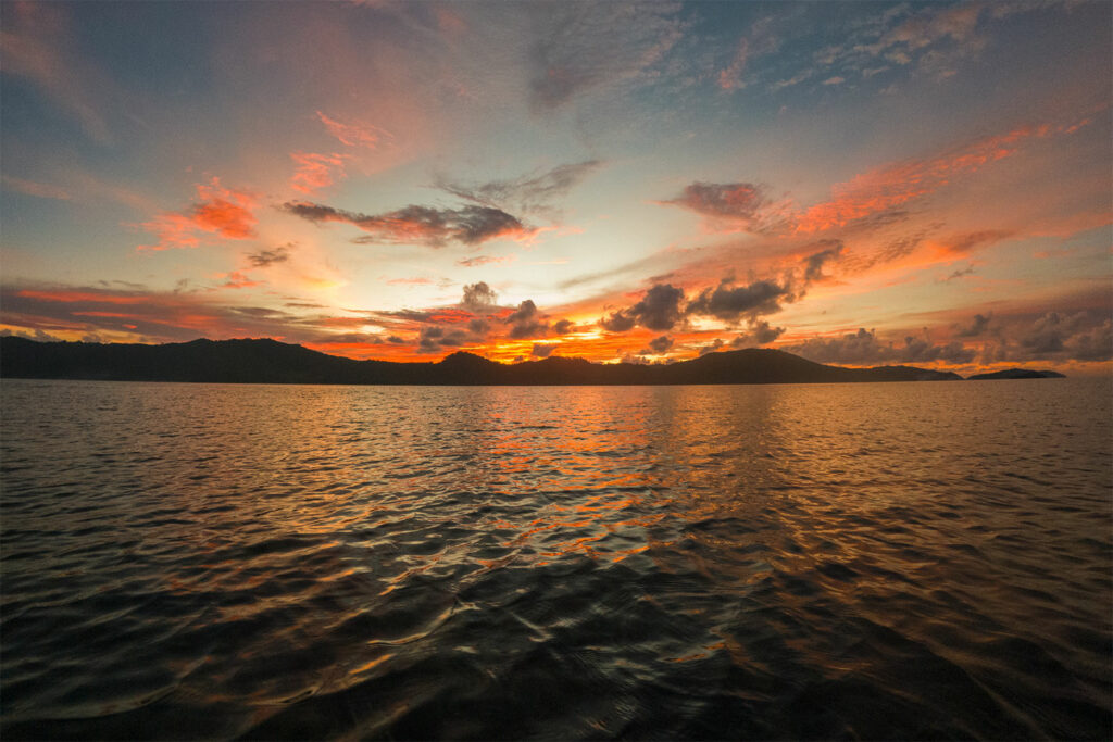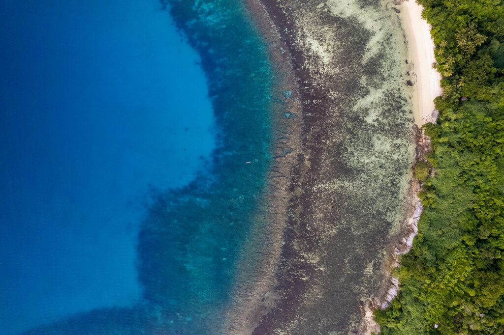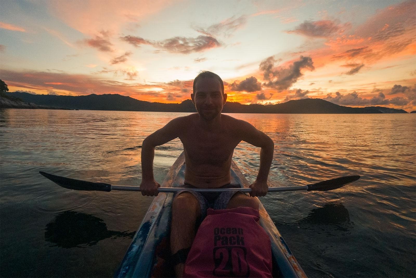 Ich wollte unbedingt noch mit dem Kayak um die Insel paddeln und habe Miri und Maila überredet mitzukommen. Oh weia! Maila hatte richtig miese Laune, bis wir um die erste Ecke der Insel herumgepaddelt sind. Dann war der vorherige Frust wie weggezaubert und wir hatten einen wunderschönen Abschluss über dem Korallengarten. Zu einem wunderschönen Sonnenuntergang sind wir drei dann zurück zu unserem Strand gepaddelt. Da das Meer sehr ruhig war, habe ich vom Kayak aus die Drohne gestartet und ein paar tolle Aufnahmen machen können.