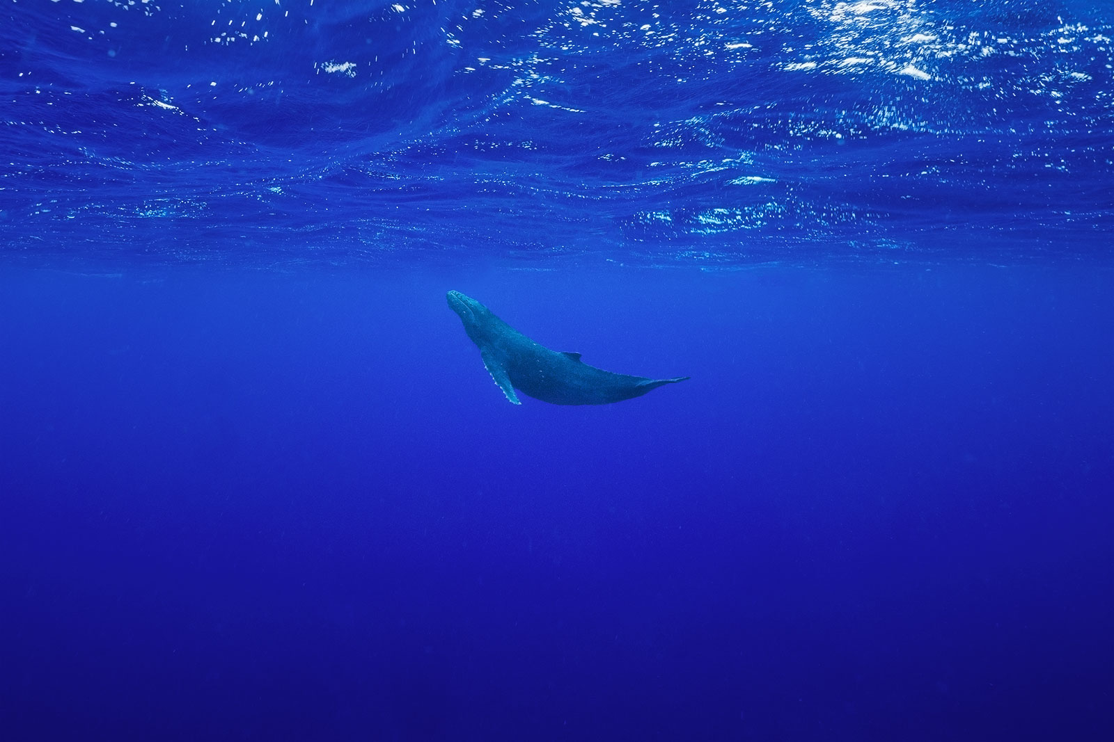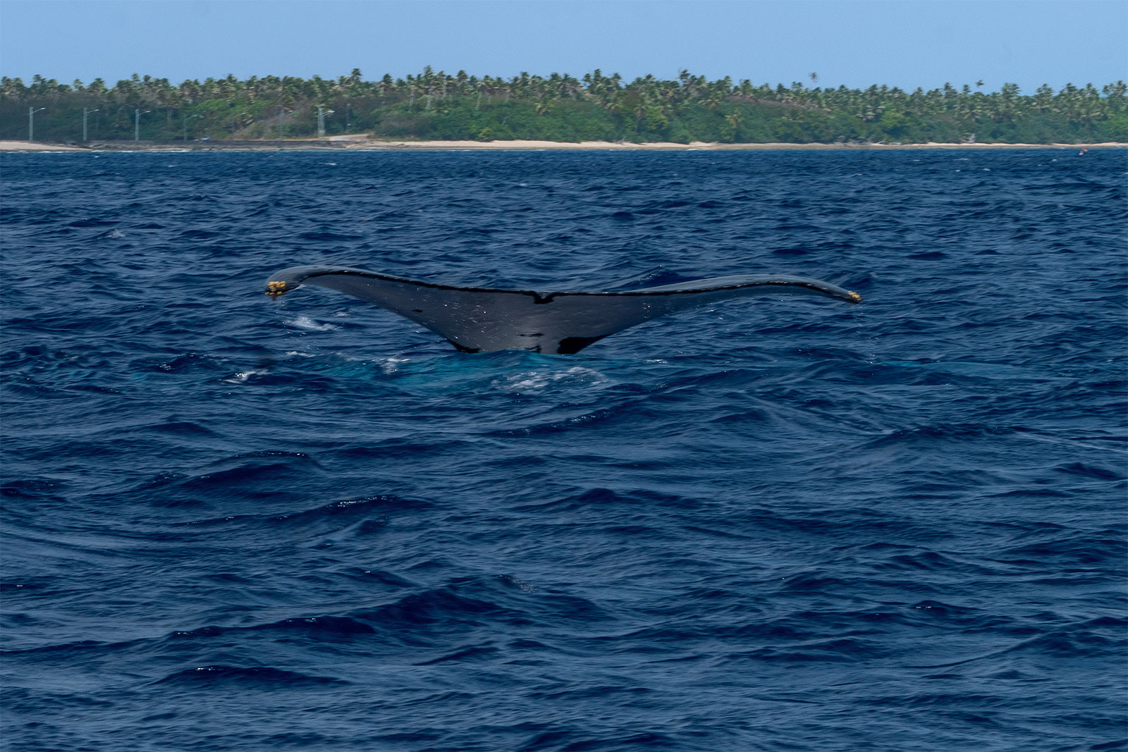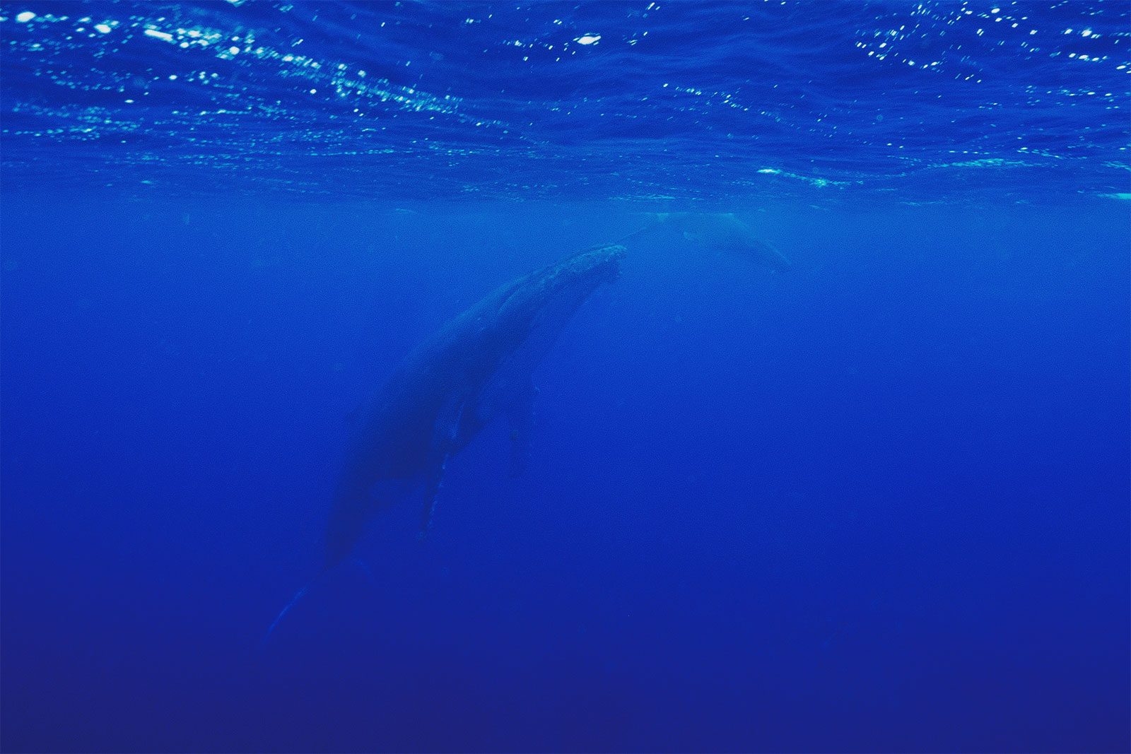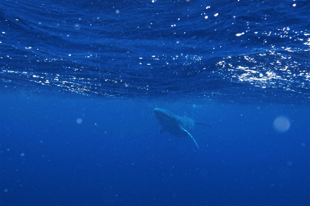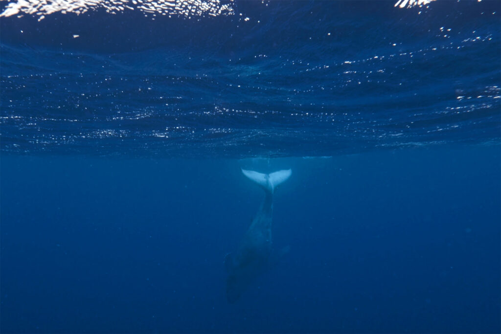 Und da war es dann endlich soweit! Der Moment war gekommen, auf den ich schon so lange gewartet habe und der mir schon so oft verwehrt blieb. Der Guide gab das „Go“ und ich bin rein gehüpft, mitten in das schier endlose, tiefe Blau! Alleine das schon ein unglaubliches Gefühl hier inmitten des endlosen Pazifiks! Nach ein paar Paddelschlägen waren wir direkt über der Mutter, die in ca. 40 Meter Tiefe unter uns ruhte. Man konnte die Konturen erkennen. Es war aber ziemlich unwirklich, da in diesem ewigen Blaue jegliches Gefühl für Größe, Abstände und Relation verloren gehen. Auf einmal kam das kleine Walbaby aufgetaucht um Luft zu holen. Es ging dann alles ziemlich schnell. Bevor ich mich gut in Position bringen konnte, um eine gute Sicht zu haben und ein paar Bilder machen zu können, war der „Kleine“ auch schon wieder zu Mama abgetaucht. Und so weit unten war es zu milchig für gute Aufnahmen.