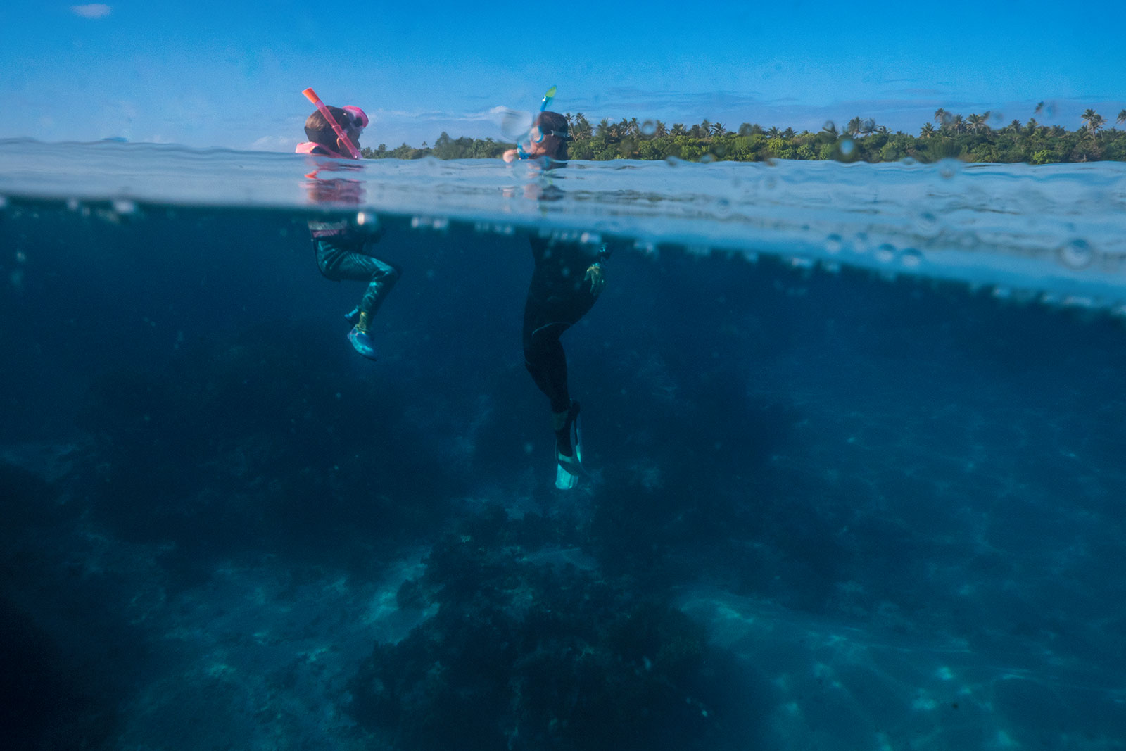 Maila und Miri sind dann zum Baden gleich ins Meer, da sie eh schon halb drin standen. Es sah auch extrem einladend aus: Wale am Horizont, vorne ein herrlicher weißer Sandstrand, hinter dir grüne Palmen und vor dir ein türkisfarbene, super klares Meer. Ist schon wirklich einzigartig hier! Wir haben ja schon viele schöne Ecken sehen dürfen, aber hier vereint sich doch einiges. Man ist sehr abgeschieden vom klassischen Tourismus. Es sind kaum mehr als 15 Leute hier, die sich so sehr verteilen, dass man am Strand eigentlich immer alleine ist. Das Wasser ist herrlich, die Umgebung einfach nur wunderschön anzuschauen. Und ein paar Meter von dir entfernt schwimmen auch noch Wale im Meer. Ganz nebenbei ist übrigens auch das Essen hervorragend. Heute Abend gab es frischen Gelbflossen-Tunfisch. Der kostet bei uns ein Vermögen und wir hatten heute zwei saftige Stück auf dem Teller liegen. Die wenigen Reisenden, die sich hier her verirrt haben wie wir, sind vom Vibe schon auch alle sehr ähnlich gepolt. Es sind tatsächlich eher ältere Neuseeländer hier, die aber alle samt wirklich cool drauf sind.