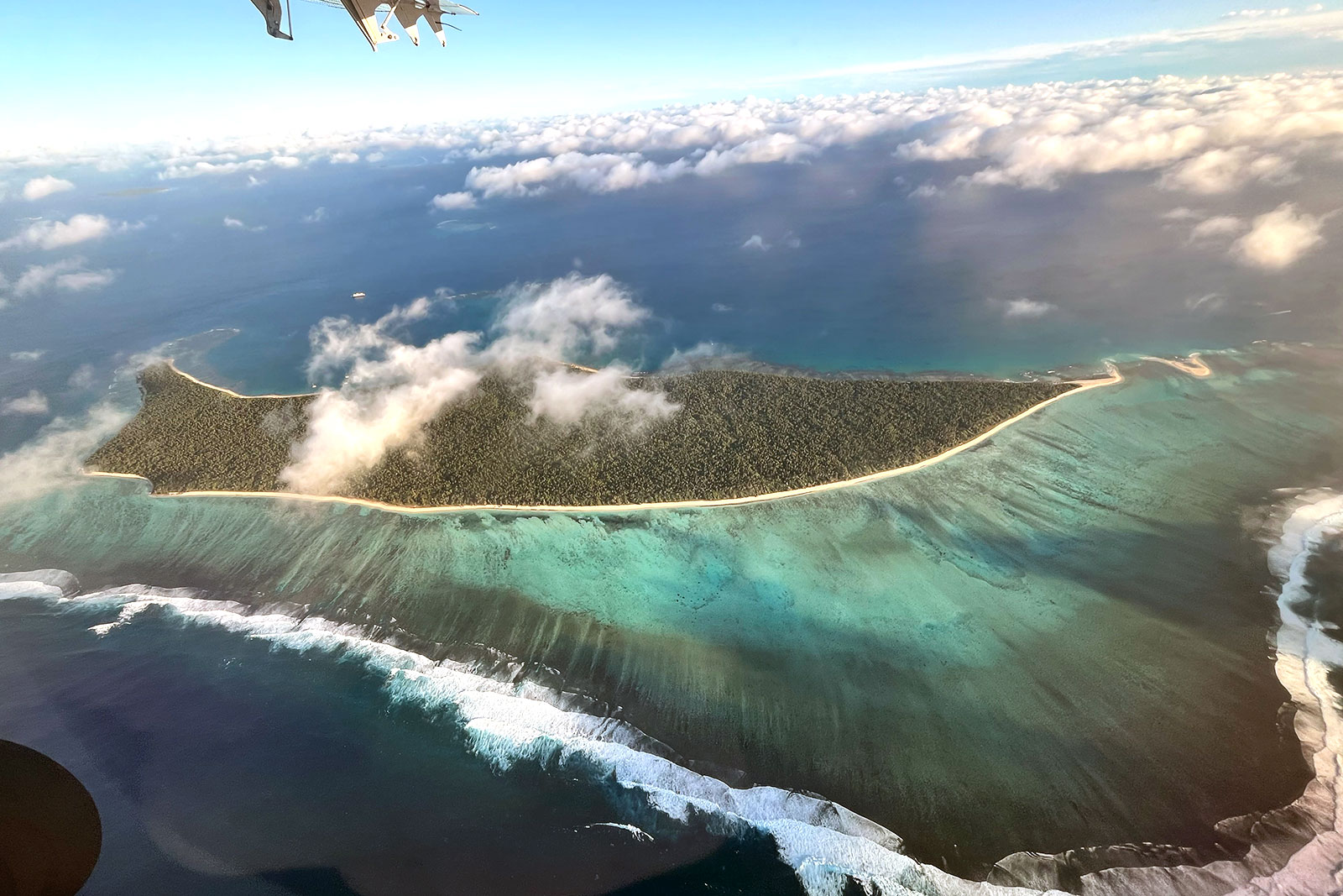 Das hier tippe ich auf dem Flug und blicke immer wieder von meinem Notsitz aus auf die zahllosen kleinen Atolle und mit Palmen bewachsenen Mini-Inseln, die aussehen wie kleine Punkte im Blau. Wir fliegen in einer recht geringen Höhe, ich schätze 2500-3000 Meter, und man sieht die Sandstrände und die Korallenriffe rings um jeder dieser kleinen Inselchen. Das sieht Hammer aus!