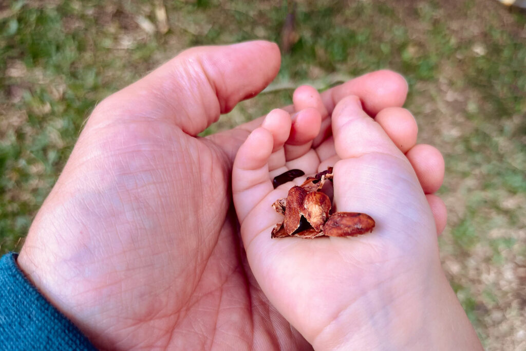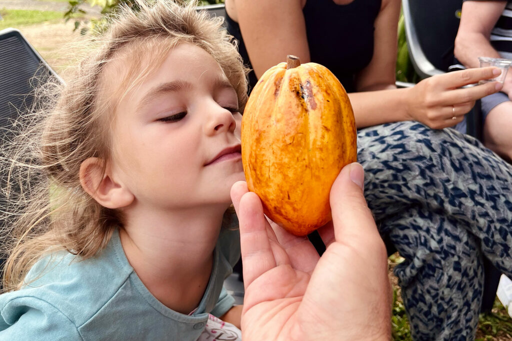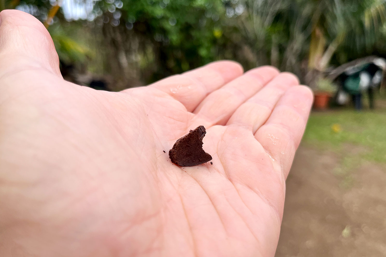 In den letzten Tagen sind wir immer wieder auf der Ringstraße an dem Schild „Chocolate Factory“ vorbeigedüst. Und weil das Wetter heute so bescheiden war, sind wir einfach mal hingefahren. Auf dem Schildchen vor der kleinen Hütte stand „closed“. Im Garten saßen allerdings einige Leute und haben gelacht. Also sind wir mal hin. Und siehe da, es wurden uns direkt Stühle hingestellt, ein Gläschen mit Chili-Schnaps in die Hand gedrückt und wir mussten erzählen, wo wir denn herkommen. Wie sich später herausstellte, ist samstags gar nicht geöffnet und es gibt auch keine Führungen. Dem selfmade Kakao-Bauer war aber scheinbar langweilig und er hätte eh nichts anderes gemacht, als seinen Chili-Schnaps zu trinken. Es verging im Übringen exakt genau so viel Zeit, wie es dauerte diesen Satz zu lesen, bis wir schon das zweite Gläslein Schnaps in der Hand hatten. Und so ging das weiter. Mit der Zeit haben wir auch gecheckt, dass es gar keine offizielle Tour ist. Viel mehr sind die anderen hier auch zufällig reingestolpert. Und während sich die anderen nach unserer Ankunft krampfhaft versuchten aus den Fängen des Kakao-Bauern zu befreien, ist uns das nicht gelungen. Also haben wir – auch nicht ganz unfreiwillig – eine kostenlose Klein-Farmtour bekommen, inkl. der Verköstigung der fertigen, reinen, dunklen Kakaopaste. Das war wirklich gut und interessant, auch wenn der gute Mann schon ordentlich Bohnen in der Krone hatte. Maila hat sich wacker geschlagen und bis zur Verköstigung durchgehalten. Dann war ihr das Gelalle zu doof und sie ist mit Kopfhörer ins Auto gesessen.