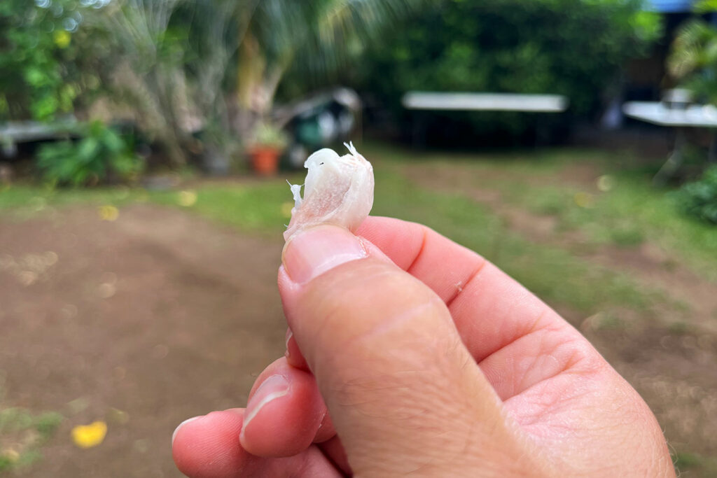 Wir hatten so eine Kakao-Farm-Besichtigung schon mal in Costa Rica gemacht. Aber da war das Ganze sehr professionell und fast schon industriell. Hier ist eigentlich nur dieser selfmade Kakao-Bauer, der sich vor 10 Jahren überlegt hat, dass er jetzt Kakao-Bauer wird. Er hat sich alles mehr oder weniger selbst angeeignet und greift dabei auf Wissen im Umgang mit den Reifegraden von Banane zurück. Auch einige Prozesse handhabt er anders als man es üblicherweise tun würde. Viel Bauchgefühl, ein Schuss Naivität und ganz viel sympathisches Auf-Gut-Glück ist seine Methode. Die Regierung hat ihm nach eigener Aussage die Aufgabe auferlegt, zu schauen, ob man auf den Cook Islands Kakao Farmen betreiben kann. Unterstützt wird er wohl nicht. Er finanziert sich rein durch den Tourismus. Ich hoffe für ihn, dass er das normal anders handhabt. Er wollte nämlich kein Geld von uns, trotz mehrfacher und teils schon aufdringlicher Nachfragerei unsererseits. Und man konnte auch nichts kaufen! Keine fertige Schokolade, keine abgepackten Bohnen. Also ein richtig guter Geschäftsmann, der Kakao-Bauer. Wir mussten ihn fast schon dazu überreden, dass er uns einfach ein paar Döschen von seiner fertigen Kakaopaste verkauft. Das hat er dann getan. Allerdings hatte er dafür weder Behältnis, noch Label oder sonst was. Irgendwie sympathisch, auch wenn ich diesem Bussines keine allzu große Zukunft prophezeien würde. Es war auf jeden Fall ein sehr lustiger und fast schon abenteuerlicher Ausflug ins „Hinterland“ von Rarotonga. Sehr empfehlenswert!