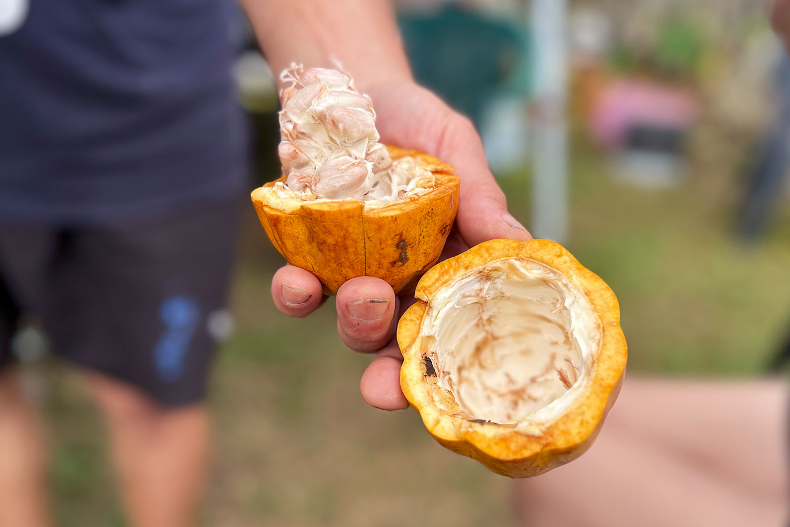 Los ging es auf jeden Fall mit einer frischen und reifen Kakao-Frucht. Die hat er mittig aufgeschnitten, um uns die Kirschen mit dem Fruchtfleisch zu zeigen. Das kann man essen und es schmeckt einer Litschi nicht ganz unähnlich. Wenn man die Bohne auch zerkaut, bekommt man einen leicht bitteren Geschmack. Der nächste Schritt ist die Fermentierung. In seinem Fall: alle Bohnen in eine Plastikkiste, Deckel drauf und Chili-Schnaps trinken, bis die Bohne klopft und auch mittrinken will.