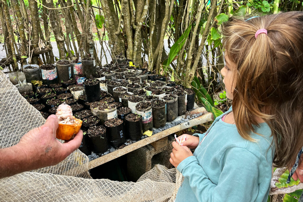 Auf dem Rückweg hat er uns dann noch die verschiedenen Stadien des Kakao-Baumes gezeigt. Die vielen kleinen Setzlinge bleiben ein Jahr lang in den abgeschnittenen Plastikflaschen, ganz so, wie es die Natur vorgesehen hat. Nach ca. zwei Jahren erst, werden die jungen Bäumchen dann auf der Farm im Boden eingesetzt – ohne Plastikflasche. Nach etwa 9 Jahren tragen die Kakao-Bäume das erste mal Früchte. Unserem Kakao-Bauer ist laut eigener Aussage aber eine Sensation gelungen. Angeblich habe ihn heute die frohe Kunde erreicht, dass ein 5-jähriges Bäumchen schon die ersten Früchte trägt! Darauf ein Gläschen Chili-Schnaps und morgen nochmal in Ruhe die Jahre nachzählen. Aber nicht, dass jetzt der Eindruck entsteht, dass ich mich über ihn lustig mache! Wirklich nicht! Der Typ war echt lustig drauf und ich hatte nur kurz Angst um unser Leben, als alle anderen sich mühsam aus dem Staub gemacht hatten und er einige Zeit vor uns mit dem großen Messer rumgefuchtelt hat, bevor er sich dann entschloss die Kakao-Frucht und nicht uns zu spalten.