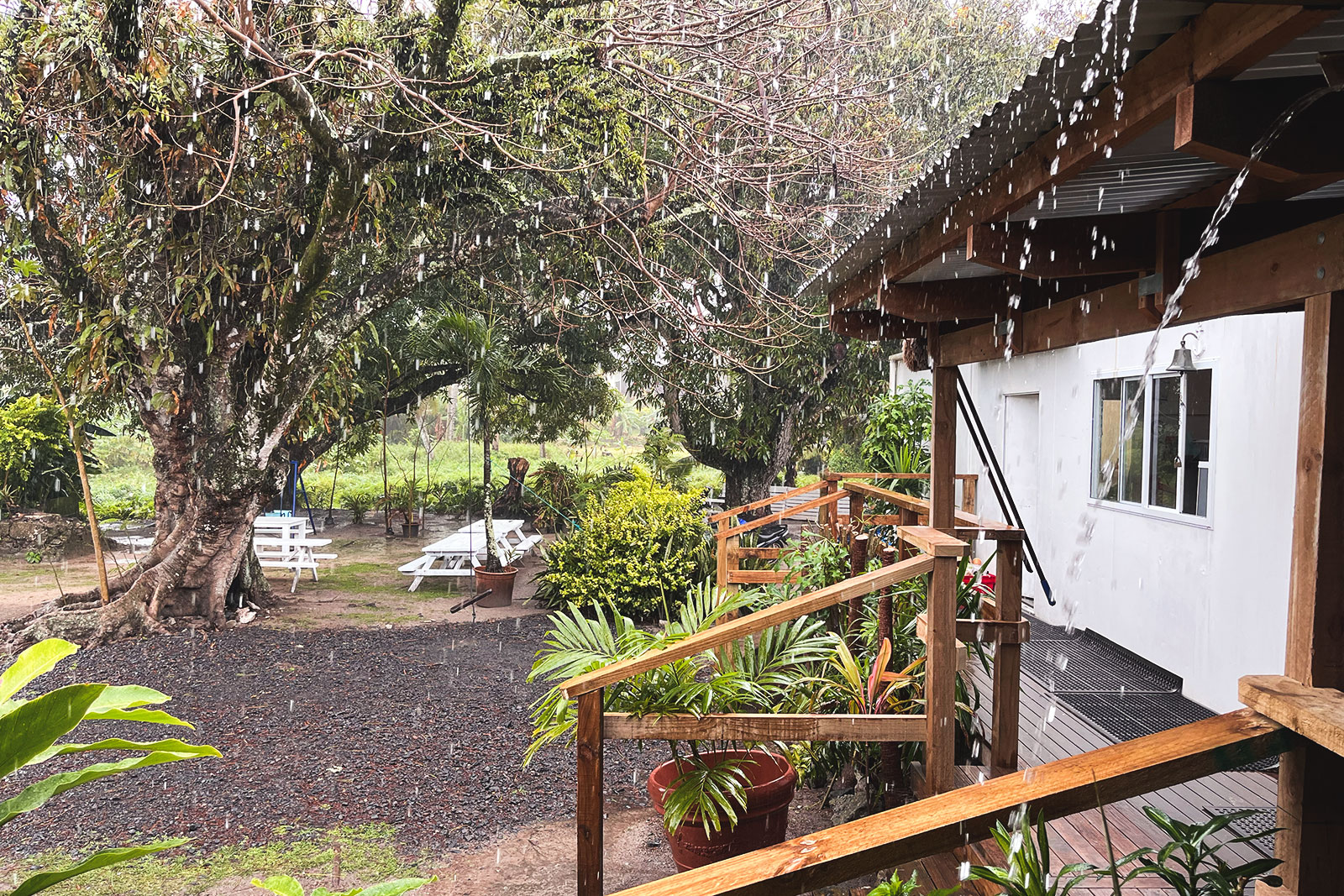 Dafür ist es hier ganz nett. Es ist das Café von Sanny, dem Musiker, den wir am zweiten Abend in der Shipwreck Hut kennengelernt haben. Er hat an dem Abend Musik gemacht. Tagsüber ist er hier im Café Koch und hat uns auch gleich wieder erkannt. Der saftig grüne Ausblick in den Garten war sehr hübsch anzuschauen, trotz Regen. Und noch wichtiger: der Kaffee war wirklich gut! Ach ja, und heute ist im Südpazifik Vatertag!
