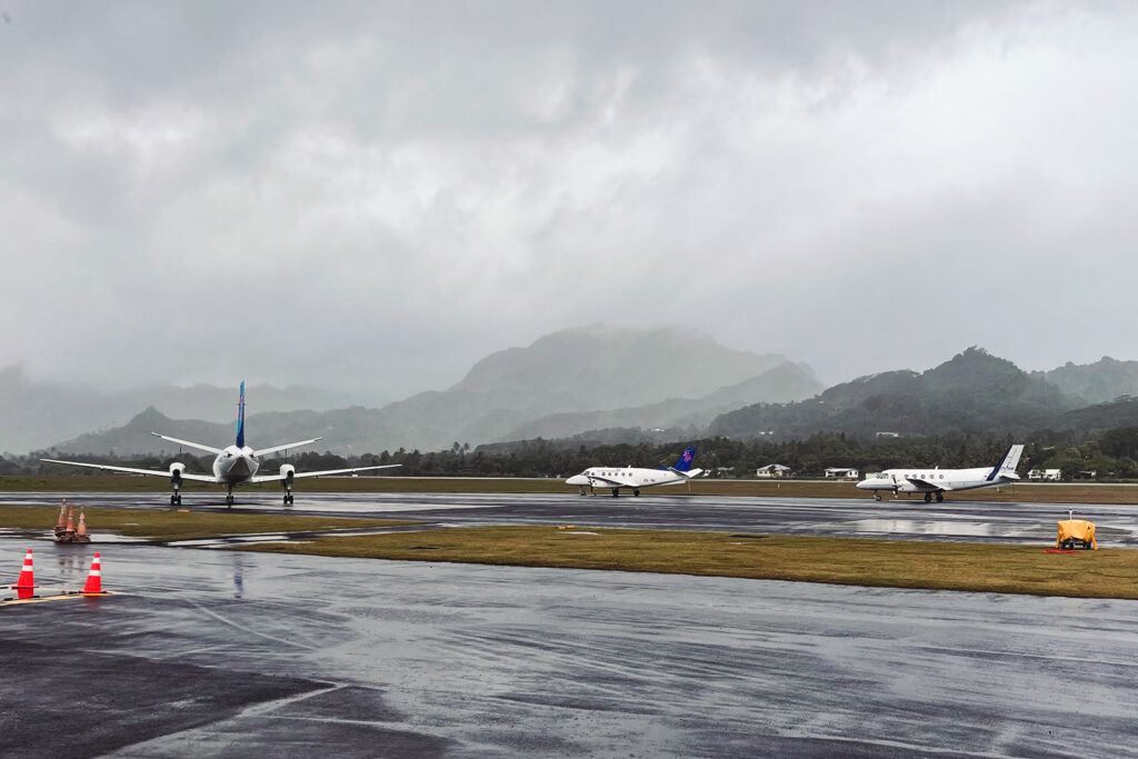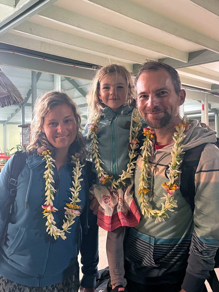 Stürmischer Wind und Regen begleitet uns in die Mini-Empfangshalle. Im Todesschock bekommt meine Verlobte eine Blumenkranz um den Hals (während ich das tippe muss ich lachen, meine Verlobte nicht!). Da sind wir also nun, in der Traum-Destination so vieler. Momentan ist’s vor allem eines: ungemütlich. Das Gepäck kam klatschnass an, alle wollten nur noch schnell in die Unterkunft.