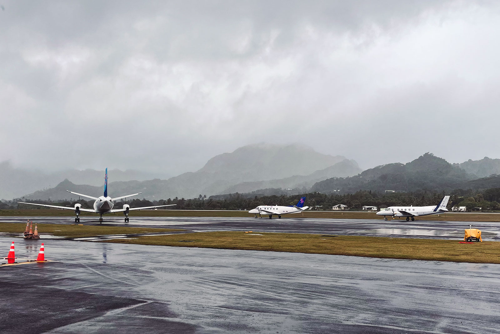 Vor drei Tagen haben wir unseren Hinflug nach Aitutaki umgebucht. Statt erst am 3. September, fliegen wir schon heute. Der Grund dafür war tatsächlich auch die sehr bescheidene Wettervorhersage für Rarotonga, die sich nun mehr als bestätigt. Nun muss allerdings noch die andere Hälfte der Wette aufgehen. Die Vorhersage für Aitutaki sah nämlich viel besser aus! Dafür muss aber erst mal unser Flug heute Abend bei diesem Sauwetter gehen. Und das tat er! Und wie! Um ehrlich zu sein, war es der schlimmste Flug, den wir je hatten. Ich habe mich schon gewundert, warum eine Flug-Stornierung vor Ort gar nicht zur Diskussion stand. Letzte Woche wurde unser Flug von Ha’apai abgesagt, da war Sturm und Regen nicht halb so schlimm wie heute auf Rarotonga und übrigens auch bei der Landung auf Aitutaki! Nach ca. 20min Flugzeit kamen wir in heftige Turbulenzen. Es ging auf und ab und rechts und links! Ich musste mich zweimal wirklich festhalten, als die kleine Propeller-Maschine ruckartig absackte. Durch das Fenster sah man nur im 2 Sekunden-Takt die Signalleuchten auf den Flügelenden den harte aufschlagenden Regen im Dunkel. Hinter uns saß eine britische Girlie-Truppe, deren MacBooks sind durch die Gegend geflogen und schließlich hart auf dem Boden gelandet. Hysterisches Lachen, halb Angst, halb Rausch begleitete jede Turbulenz. Maila hat Miri an der Hand gehalten und versucht die Mama zu beruhigen. Die darf euch dann selbst erzählen, wie sie den Flug erlebt hat. Aktuell plant sie auf jeden Fall nie mehr in ein Flugzeug zu steigen und peilt einen dauerhaften Aufenthalt auf Aitutaki an.