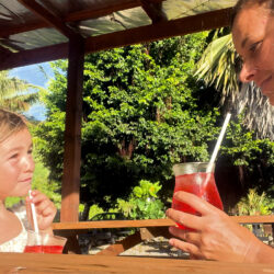 Maila und ich frühstücken jedenfalls erst mal gemütlich und versuchen, wie jeden Tag, die diebischen Vögel davon abzuhalten unsere Früchte und den Toast zu klauen. Die sehen übrigens exakt wie Comic-Diebe mit Augenbinde aus. Danach beschließen wir eine Runde an unserem Strandabschnitt schwimmen zu gehen. Maila übt das Schwimmen, auch wenn das Wasser nicht ganz so türkis ist und wir ab und zu – versehentlich- auf eine der vielen Seegurken treten. Nach der anschließenden Dusche gibt’s Pizza von gestern und wir hören Hörbuch bzw. lesen eine Runde. Dann ist auch mal wieder Waschtag angesagt und ich hänge die Wäsche schnell noch auf, bevor ich mich auf den Weg zur Wasserstation mache, um für die Familie Wasser zu holen.