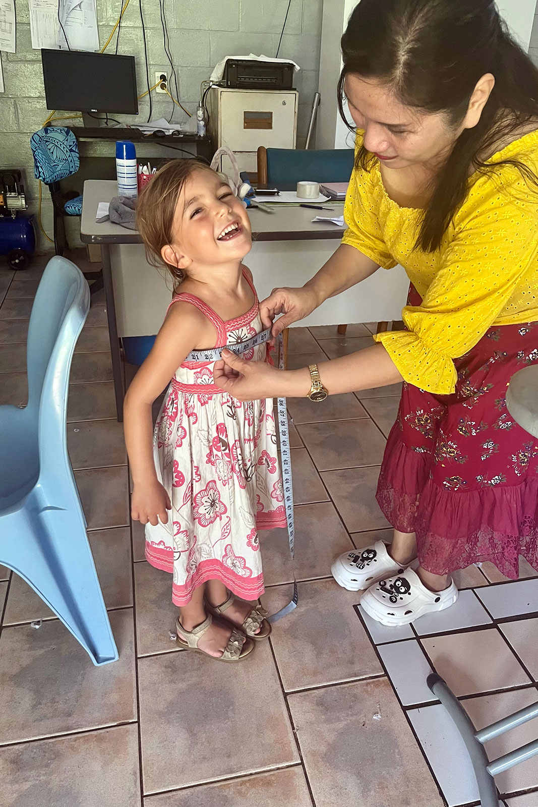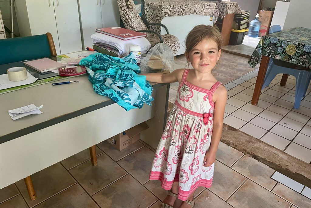 Auf dem Rückweg halte ich mit dem Roller an einem kleinen Shop mit Kleidern. Maila wünscht sich unbedingt ein Urlaubskleid. Leider gibt es nur Ware aus Indien und die Kleider sind Maila vermutlich zu groß, aber die nette Verkäuferin gibt mir den Tipp mal nebenan bei der Schneiderin zu fragen. Letztlich bin ich dann schnell heimgedüst, um Maila abzuholen, da sie natürlich für ein maßgeschneidertes Kleid dabei sein musste. Sie hat sich den Stoff ausgesucht und wurde vermessen. Am nächsten Tag sollte das Kleid fertig sein und wir sind schon sehr gespannt. Auf dem Rückweg haben wir dann noch Abendessen eingekauft (Spaghetti und Tomatensoße) und die uns dann zu Hause schmecken lassen. Für Marc gab’s Nudelsuppe.
