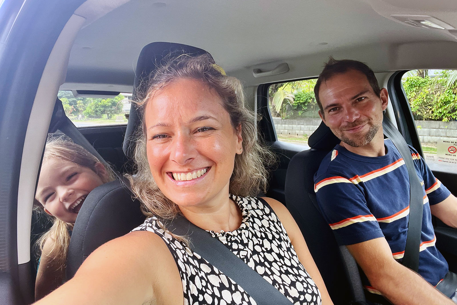 Wir haben gleich morgens früh die Fähre genommen und schon beim Annähern an die Insel Moorea gewusst, dass es uns hier viel besser gefallen wird! Vom kleinen Hafen aus ragen direkt die Berge steil nach oben und grün bewachsen. Da hat ein bißchen was von La Reunion. Nicht ganz so krass, aber gleich schöne Ästhetik. Ich hab mich dann zu AVIS aufgemacht und einen der letzten Mietwagen bekommen, die noch zur Verfügung standen. Unsere Unterkunft hat uns zwar auch einen angeboten, aber da hätten wir 2x ein Taxi benötigt. Und günstig war deren Angebot auch nicht gerade. Also lieber gleich einen Mietwagen und die Taxikosten sparen. Billig war es nicht, aber wir wussten ja bereits, dass hier in französisch Polynesien gar nichts günstig ist. Dafür habe ich für den tiefsten Preis einen SUV bekommen, in den alles gut reinpasst. Und Miri und Maila dürfen im Urlaub auch mal in einem Auto sitzen. Bisher waren unsere Fortbewegungsmittel eher in der Kategorie RTL2-Niveau „Die Ludolfs“. Manchmal auch knapp darunter…