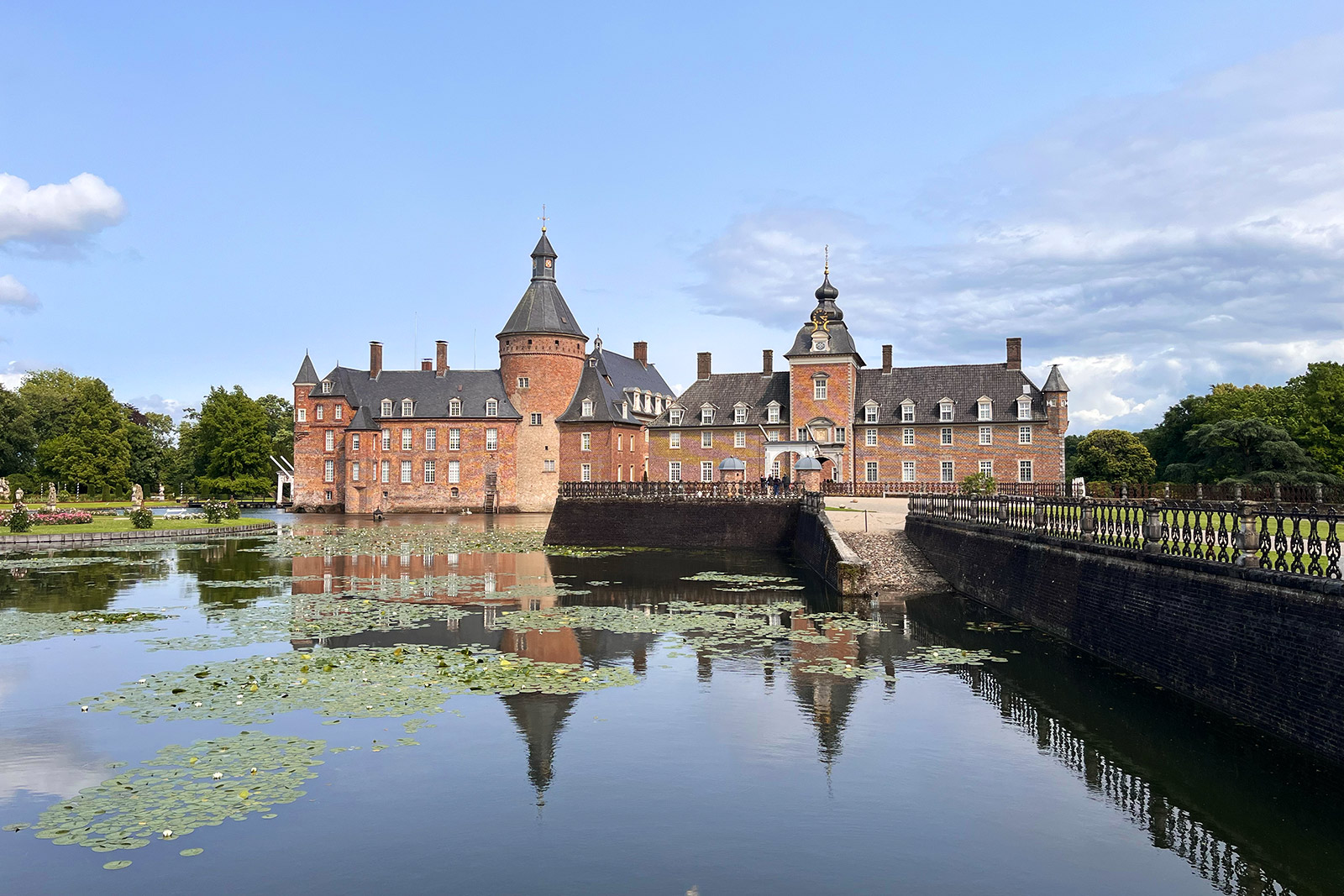 Auf jeden Fall hat die Sache einen kleinen Haken. Wir fliegen von Amsterdam, was einen kleinen Abstecher in diese schöne Stadt ermöglicht. Den Plan in einem durchzufahren haben wir kurz vor der niederländischen Grenze verworfen. Wir waren alle erschöpft und müde. Bei Isselburg habe ich mich an ein tolles Open Air Konzert mit meiner alten Band schein23 erinnert – das Halden Open Air. Da war’s schön – zumindest in meiner Erinnerung. Also sind wir rausgefahren und direkt in die Arme des Wasserschlosses Anholt. Es regnet bei unserer Ankunft noch stark, aber nach dem wir einen sehr leckeren Apfelkuchen im Schlosscafe gefuttert hatten, kam die Sonne raus. Wirklich nett hier.