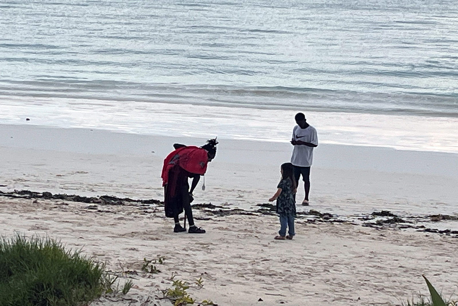 Später am Nachmittag reisst es urplötzlich auf, der Regen stoppt innerhalb von wenigen Momenten und die Sonne scheint, als habe das Wetter des bisherigen Tages nie stattgefunden. Verrückt. Maila hat natürlich gleich wieder Kontakte geknüpft und einen Masai zum Muscheln sammeln verhaftet. Ich habe ihr vorgeschlagen einen die Muscheln dann wieder an die Masai zu verkaufen, die damit ihren Schmuck herstellen.