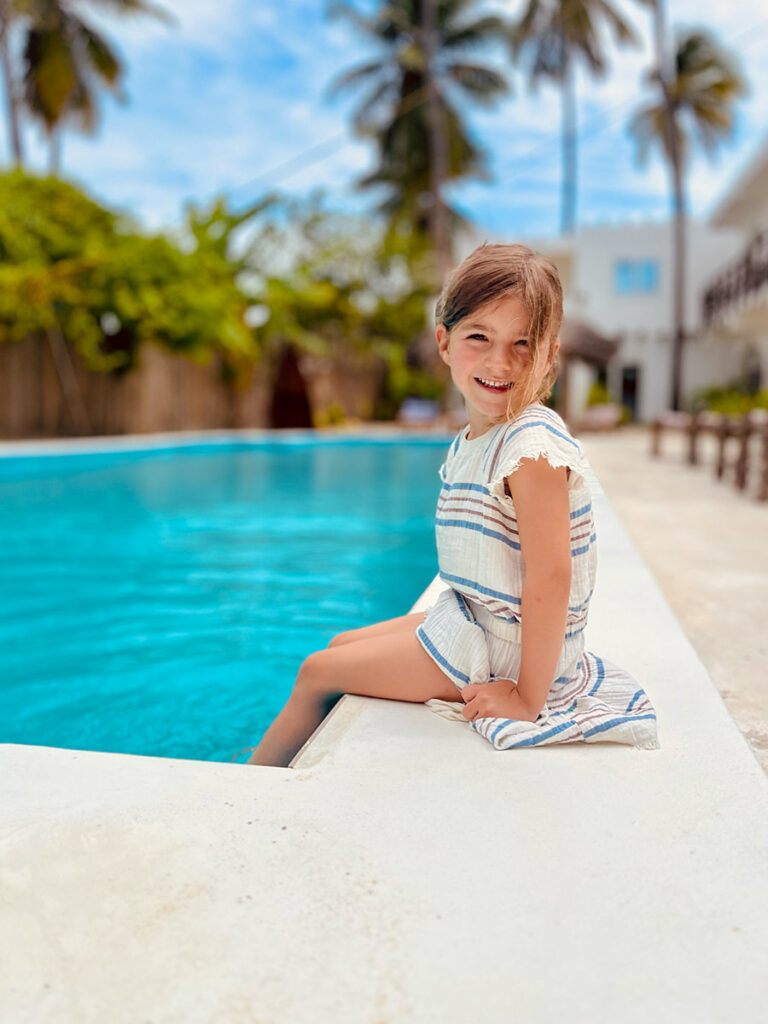 Fast den ganzen Tag über hatten wir heute Regen. Nach dem gescheiterten Versuch um halb Zwölf noch irgendwo Frühstück zu bekommen, haben wir schließlich beim Massai Shop Fladenbrot aus Kokosnuss gekauft. Dazu gab’s lokalen Honig. Alles sehr fettig, aber wirklich gut. Anschließend ging es in die Lodge nebenan, wo Maila den Pool nutzen konnte. In deren Restaurant gibt es sehr genialen rohen Thunfisch mit Avocado-Creme – und Wifi. Ließ sich gut aushalten.