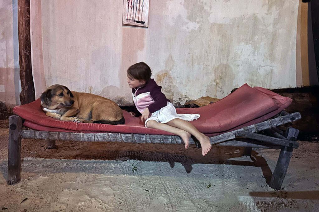 Und am Abend schließlich sind wir erneut zum Essen in die Zanzi Barbar, wo es den legendären Tuna Tataki gab. Der Tag bestand also aus Essen. Die Hündin Barbar lag auf einer Liege. Ich hab sie gestreichelt und hatte das Gefühl, die kennt uns noch von den letzten Besuchen. Auf jeden Fall war Maila ganz neugierig zu erfahren, woher wir den Hund und den Besitzer David kennen. Und warum sie damals noch nicht dabei war. Also einmal war sie dabei…