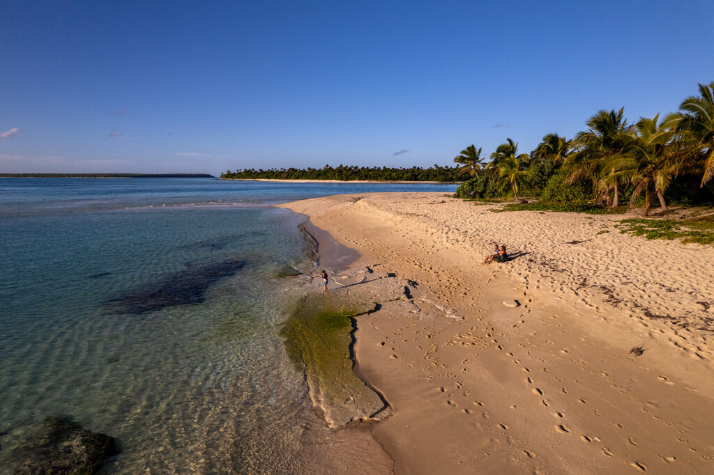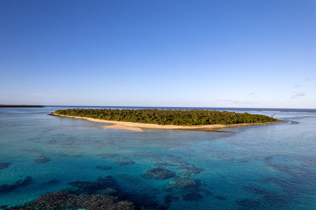 Wow! Allein der Anblick des Pazifik und dieser endlos vielen kleinen und wunderschönen Atolle ist die Reise wert! Manche der Inseln sind gerade mal so groß, dass 6-7 Palmen darauf Platz finden. Rundherum in den schönsten Blau- und Türkistönen die Lagunen. Man sieht die Korallen und die Wände, wie sie wieder in die Tiefe abfallen.