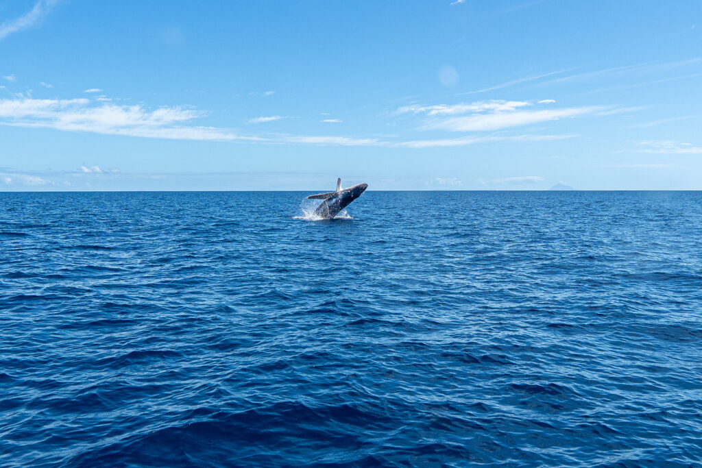 Und kaum waren wir auf dem Boot, haben sie sich fast alle verkrümelt und sind abgetaucht. Nach ein paar Minuten waren wir dann einer Buckelwal-Mama mit Kälbchen auf der Spur. Die hatten jedoch keine Lust mit uns zu schwimmen und sind immer weggetaucht. Und so haben wir sie in Ruhe gelassen. Überall haben wir winkende Seiten-Flossen und springende Wale gesehen, aber keiner hatte Bock mit uns zu schwimmen. Dafür war aber das Spektakel über Wasser umso beeindruckender!