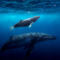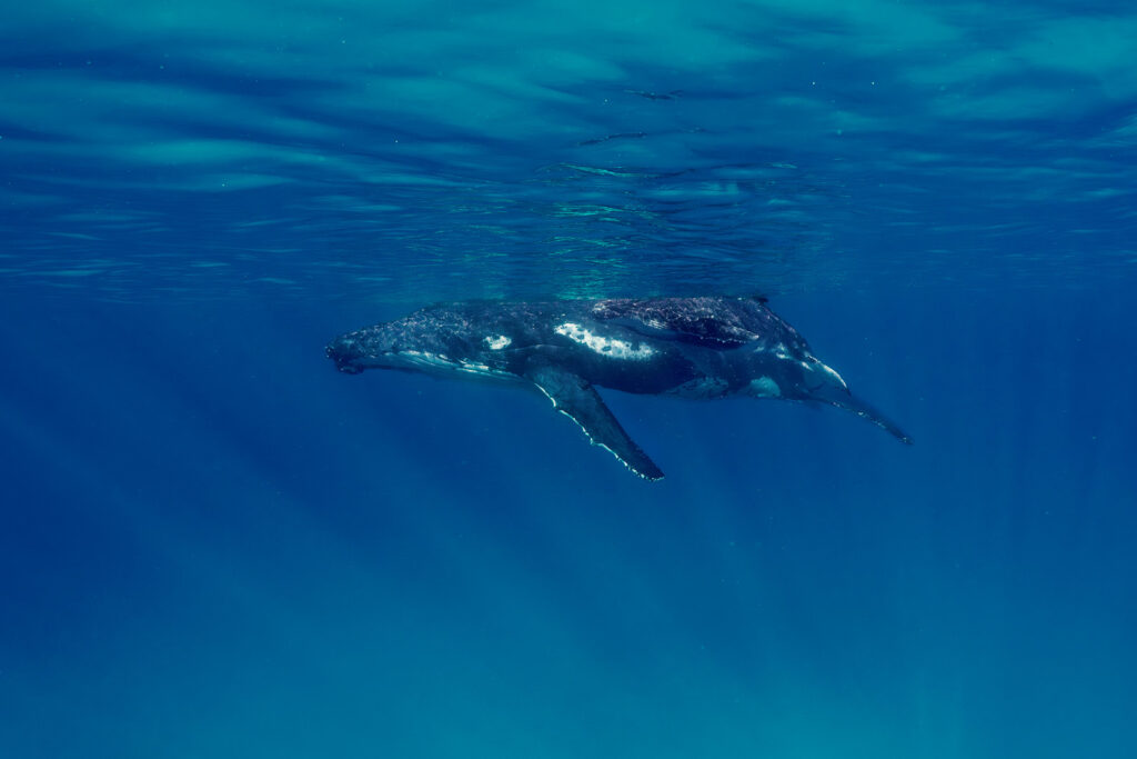 Und als wir nach knapp 4 Stunden ohne einmal im Wasser gewesen zu sein schon auf dem Heimweg waren, tauchte da plötzlich wie aus dem Nichts eine Mama mit ihrem ganz jungen Kälbchen auf. Sie blieb ganz ruhig an der Wasseroberfläche als wir uns näherten. Und dann bekamen wir das „Go“ und durften leise und vorsichtig an die beiden heranschwimmen. Maila war auf Miris Rücken und ich hatte die große Kamera mit dabei. Die Sicht Unterwasser war heute nicht ganz so gut und durch die schon recht tief stehende Sonne, haben sehr viele Schwebeteilchen im Wasser reflektiert. Trotzdem war es wahnsinnig toll die beiden Riesen auf etwa 4 Meter Entfernung beobachten zu können. Maila war ganz cool. Selbst als dann irgendwann die Eskorte dazukam. So nennt man den Buckelwal-Bullen, der oft Mama und Kälbchen zum Schutz begleitet. Er hat etwa 8 Meter entfernt zwei-, dreimal mit der Seitenflosse auf das Wasser geschlagen. Das dient der Kommunikation untereinander, kann aber auch eine Drohgebärde sein, um seine Familie zu beschützen. Also gab der Guide das Kommando zum Rückzug und wir sind dann ruhig zum Boot zurückgeschwommen und konnten die Familie noch wegtauchen sehen.