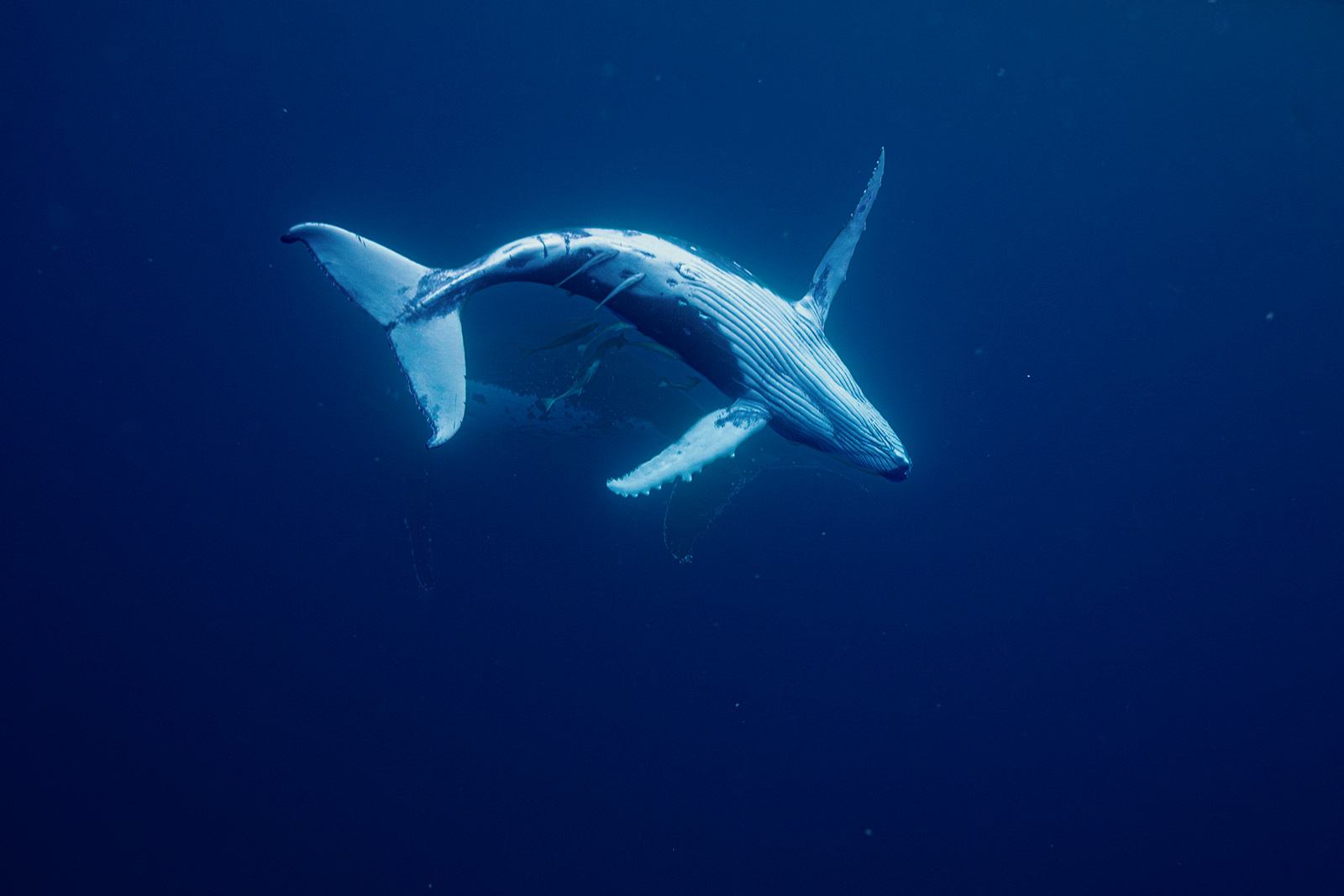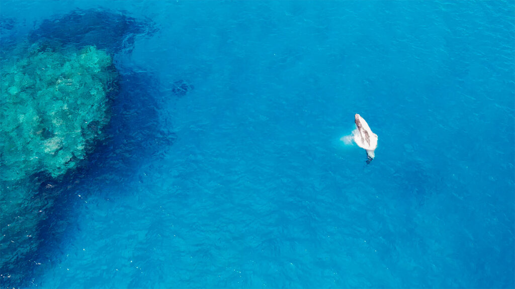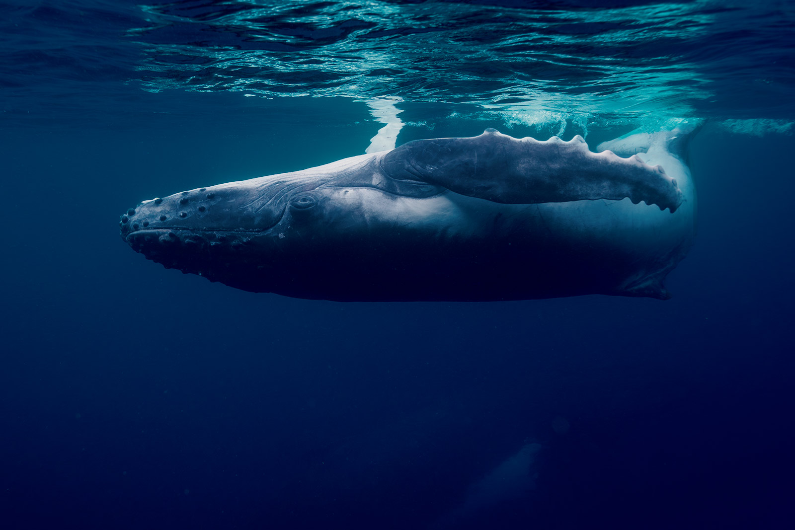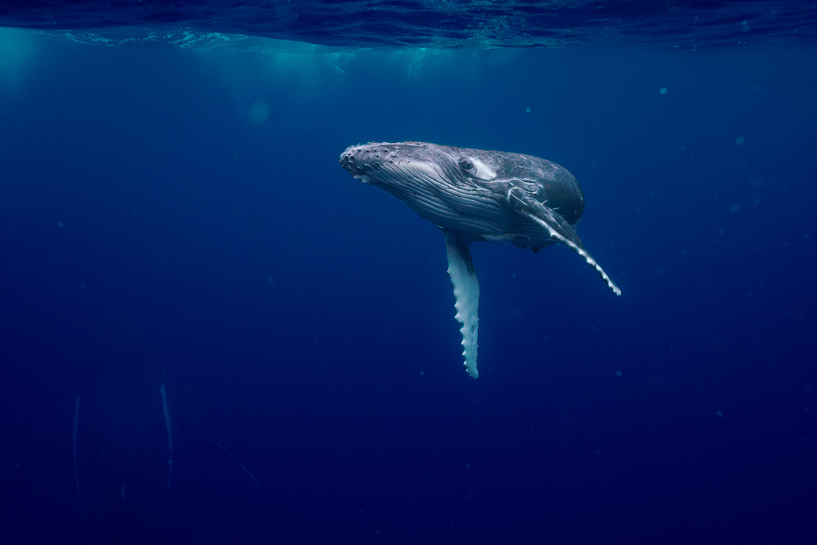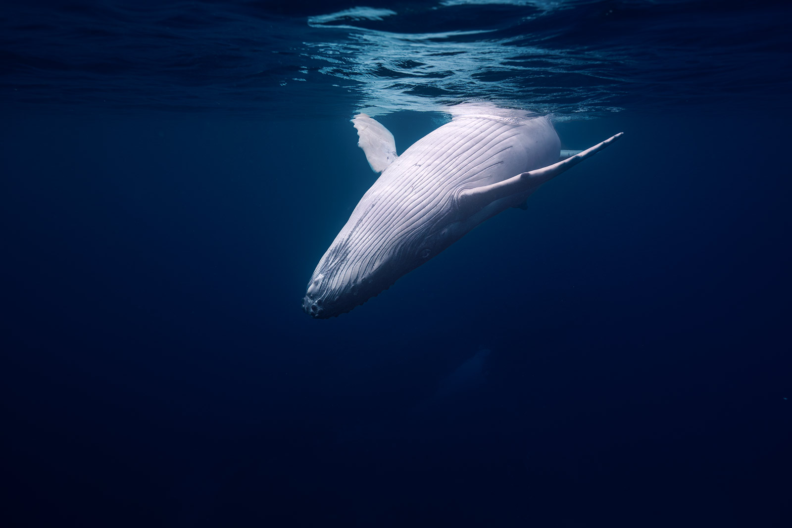 Ich habe nur zwei oder drei Fotos gemacht und die restliche Zeit still im Wasser getrieben, um mir das alles fest einzubrennen. Wunderschön! Ich finde, das macht etwas mit einem. Schwer zu beschreiben. Es ist so respektvoll und urmenschlich, was sich da draußen in tiefen Ozean abspielt bei so einer Begegnung auf „Augenhöhe“. Das Kälbchen schwamm ganz langsam direkt auf mich zu, blieb für wenige Sekunden etwa 2 Meter vor mir still wartend und ich konnte die Oberfläche seiner Haut, die Knubbel auf seiner Spitze und sein Auge ganz klar und deutlich sehen. Das sind irrsinnig intime Momente. Wahnsinn. Davon gibt es kein Foto. Ich habe in diesem Moment ganz still zugeschaut, das Kameragehäuse treiben lassen und mich nicht bewegt. Ganz im Sinne des Buches – dieses Foto war mit scheißegal.
