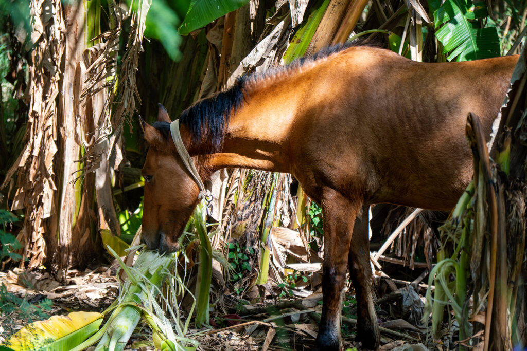 Auf jeden Fall haben Maila und ich beschlossen umzukehren. Miri ist dann alleine ins Dörfchen weiter. Auf dem Rückweg haben wir noch Ute getroffen, eine lustige Solo-Reisende, die sich gerne mit Maila unterhält. Wir haben sie die Tage zuvor schon beim täglichen Sundowner kennengelernt. Auf halbem Wege zurück haben wir im Dschungel Lilly’s Pferde entdeckt. Eines davon war gerade damit beschäftigt eine ziemlich große Bananenstaude zu fällen. Das ist dem Pferdchen auch gelungen. Dann hat es wie wild den Stamm auseinander genommen, um an das süße Innere zu kommen.