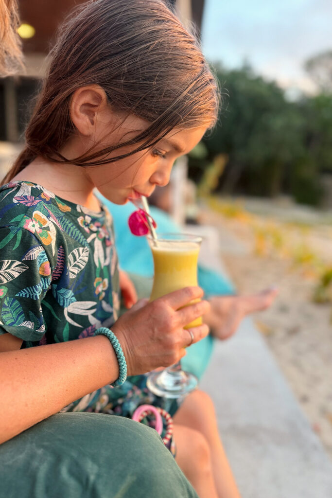 Der restliche Tag ist wieder schnell erzählt: Papa schläft sich gesund, Maila hört spannende Geschichten, Mama liest ihr Buch. Am frühen Abend geht’s mir schon deutlich besser und wir genießen die wunderbare Stimmung zum Sonnenuntergang auf dem Weg zur Happy Hour im Sandy Beach Resort. Die Barkeeper kennen Maila mittlerweile schon und daher bekommt sie jeden Abend einen Sunriser Cocktail ohne Alkohol. Bei gemütlichen Gesprächen, schöner Lichtstimmung und viel Flughund-Aktivität klingt der heutige Sonntag langsam aus.