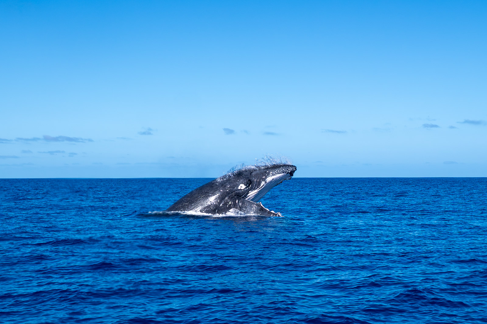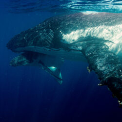 Ich ließ dann jemand anderem den Vortritt, weil er schon die Flossen anhatte. Und so hatte Miri das, was jetzt folgte, ganz für sich allein! Die Gruppe war mitten unter lauter Walbullen, die wie wild umherschwammen. Von allen Richtungen kamen sie auf die Gruppe zu. Ich hatte Miri noch gerufen, aber sie hörte mich nicht – und so wurde sie von einem plötzlich hinter ihr auftauchenden Wal überrascht. Vom Boot aus war das Spektakel über Wasser mindestens genauso beeindruckend: Einer der etwas weiter entfernten Bullen sprang gleich zweimal so weit aus dem Wasser, dass er mit dem gesamten Körper gut zwei Meter quer über die Oberfläche hinausragte. Leider war ich mit meinem Foto zu langsam. Unglaublich beeindruckend! Und auch im Wasser war es nicht weniger spektakulär: Miri war umgeben von fünf Bullen, einem Weibchen und einem Kälbchen, das wir von oben gar nicht sehen konnten.