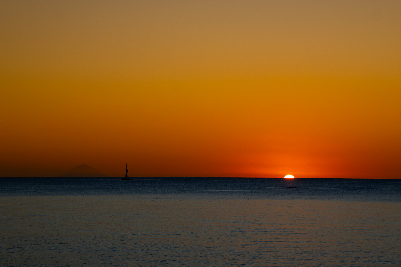 Ein unglaublicher Tag geht zu Ende! Und bei Cocktail und einem kühlen Bier genießen wir einen weiteren tollen Sonnenuntergang mit Vulkan und meinem Segelboot.