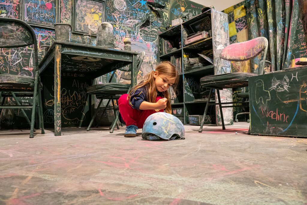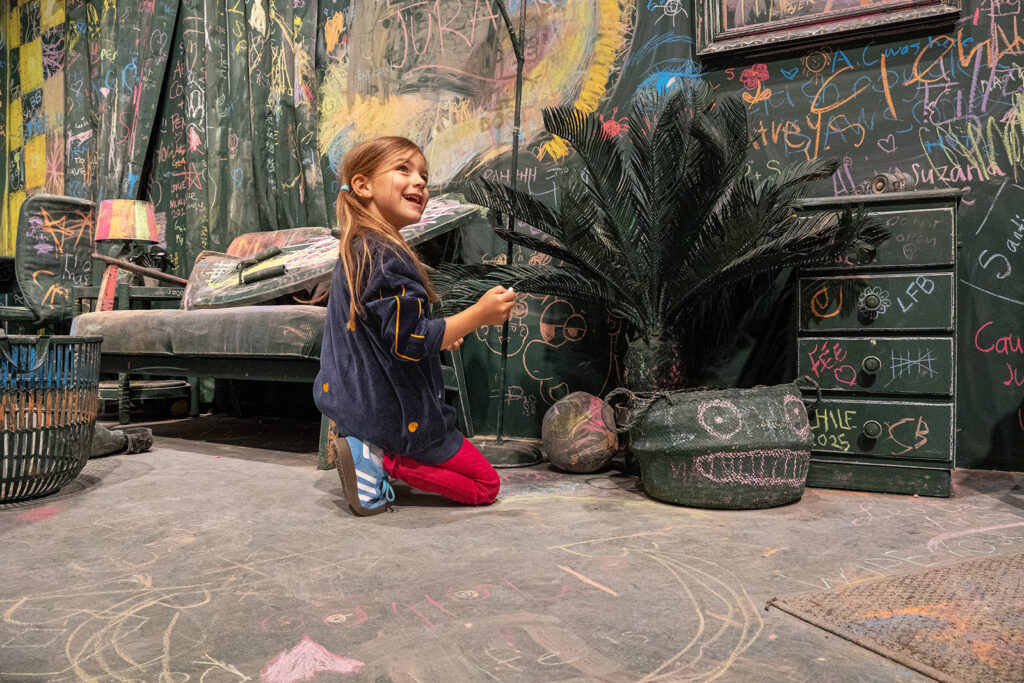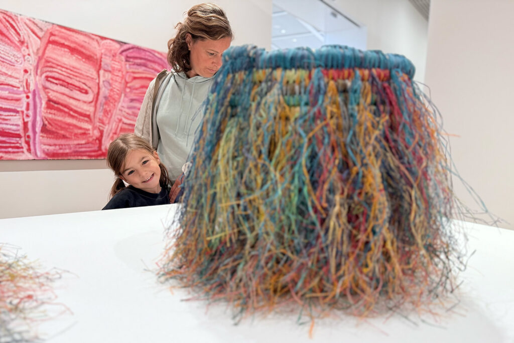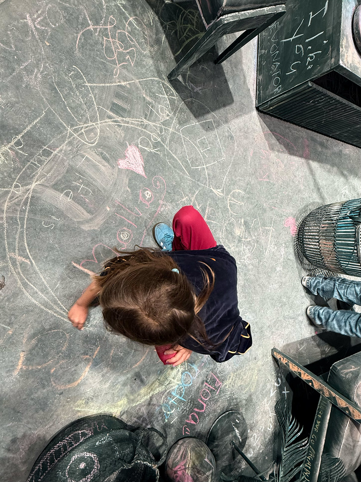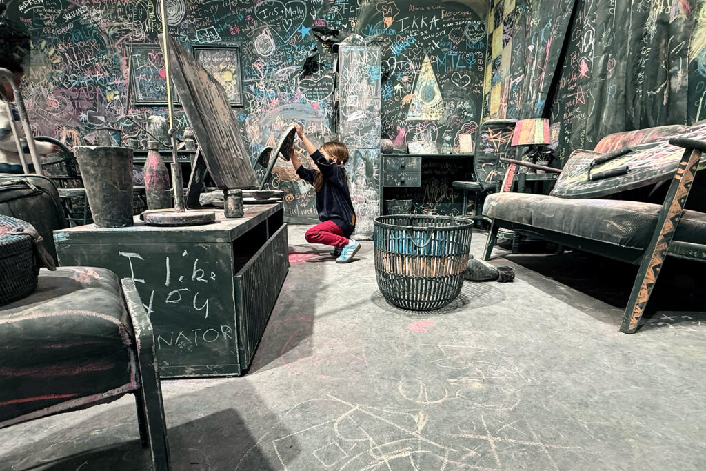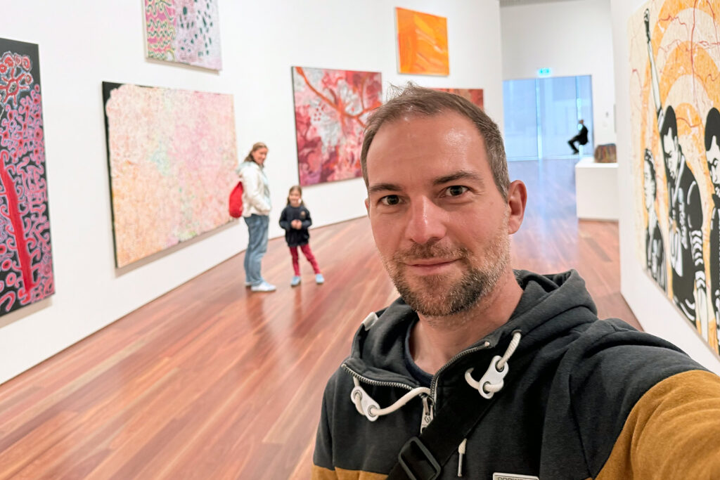 Es gab sexuelle Skulpturen mit Neonröhren aus dem Genitalbereich mit VR-Brillen. Und es gab ein Wohnzimmer, das man mit Kreide voll malen durfte. Wir haben also auch noch unser Kind Kunst machen lassen. Und es gab lustige Bilder aus Pünktchen von Aborigines und deren Kultur inspiriert. Irgendwann haben wir dann auch mal aus dem Fenster rausgeschauten. Dorthin, wo weniger Kunst war. Das war auch schön.
