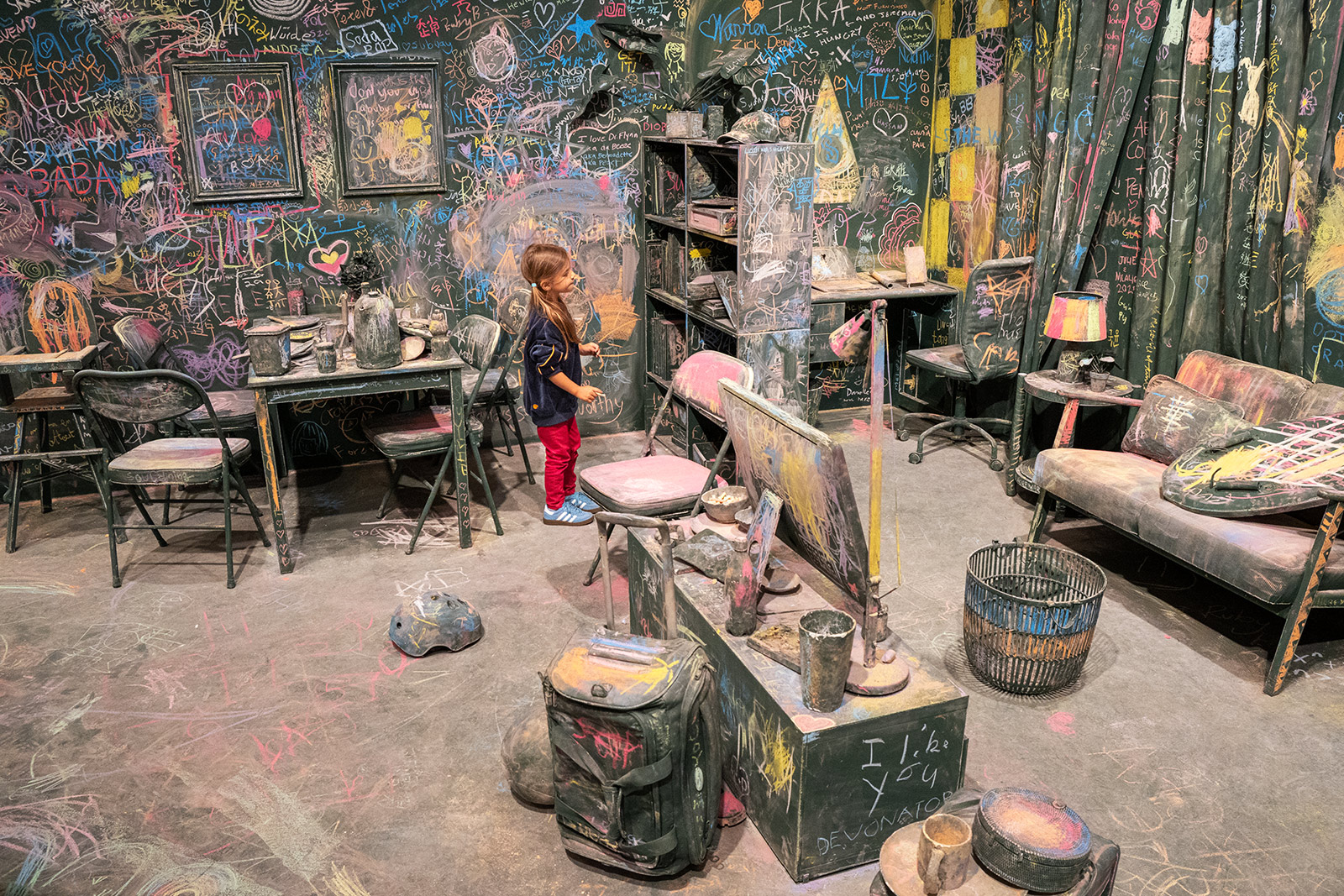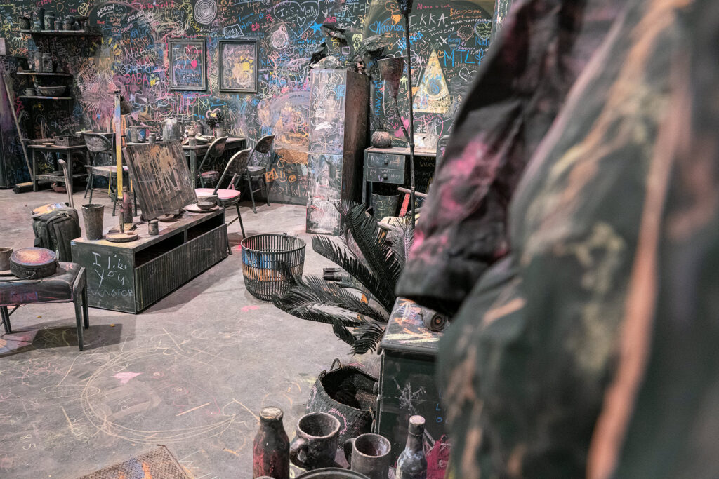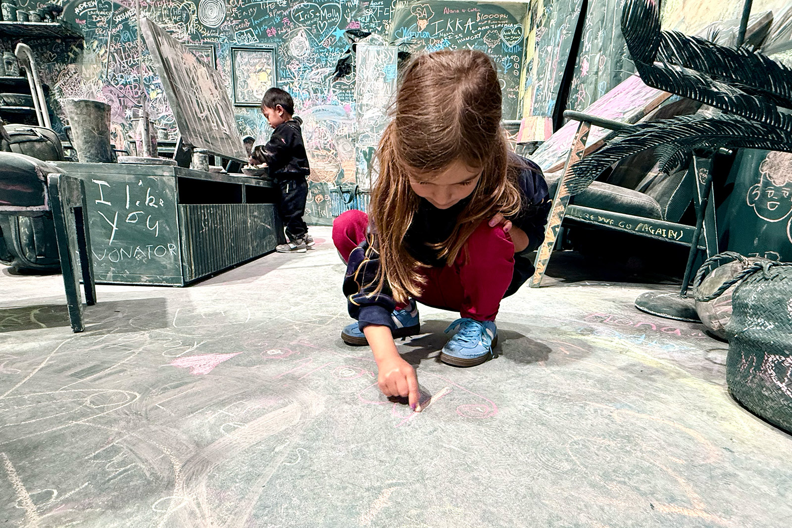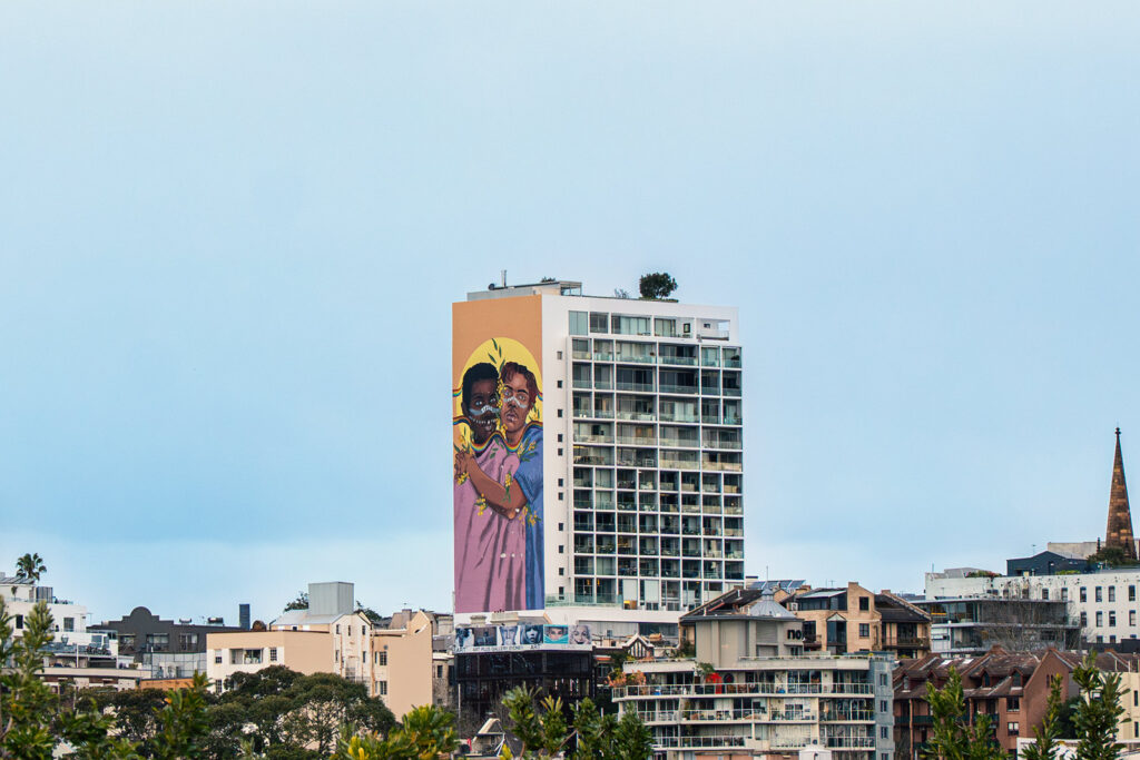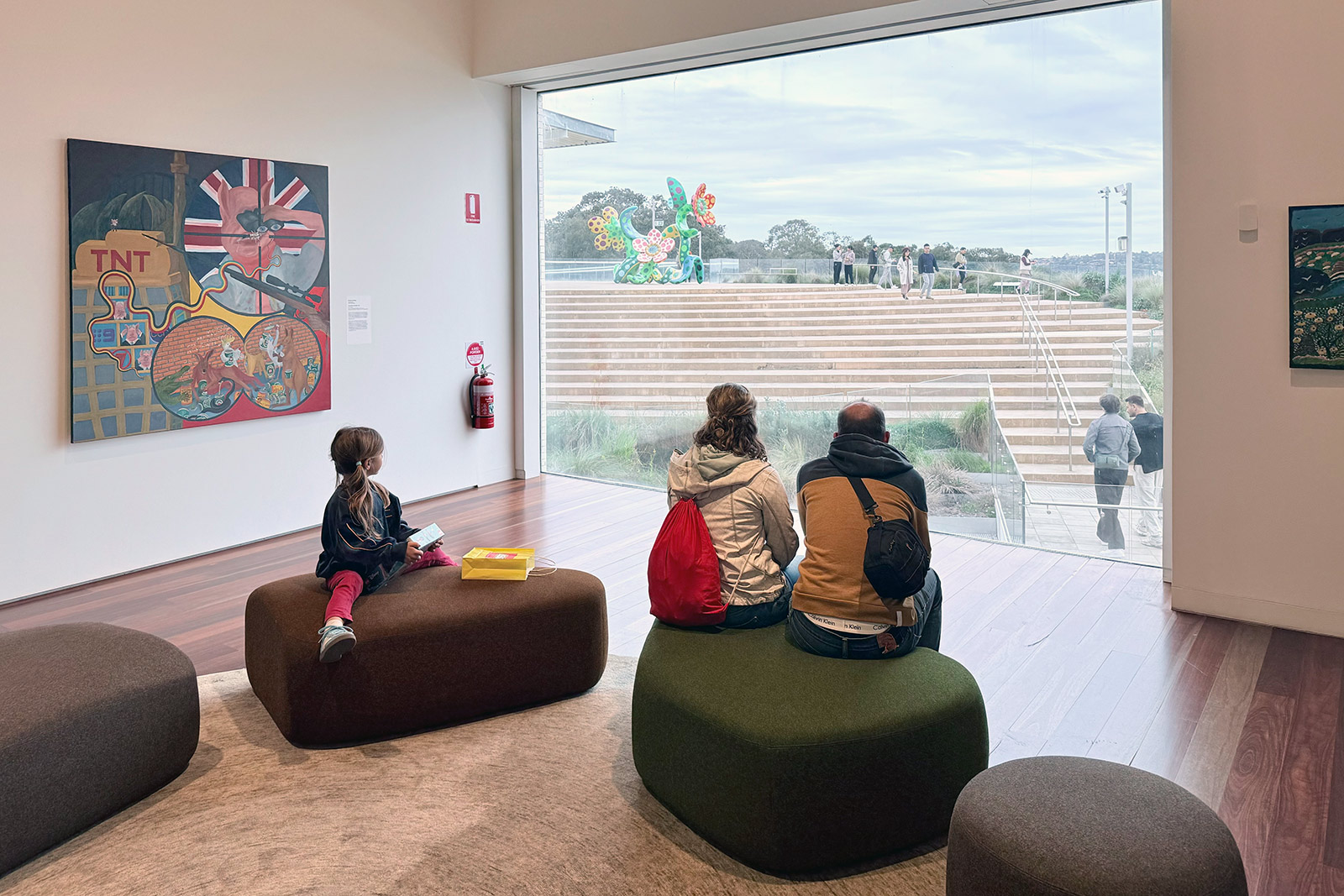 Es gab sexuelle Skulpturen mit Neonröhren aus dem Genitalbereich mit VR-Brillen. Und es gab ein Wohnzimmer, das man mit Kreide voll malen durfte. Wir haben also auch noch unser Kind Kunst machen lassen. Und es gab lustige Bilder aus Pünktchen von Aborigines und deren Kultur inspiriert. Irgendwann haben wir dann auch mal aus dem Fenster rausgeschauten. Dorthin, wo weniger Kunst war. Das war auch schön.