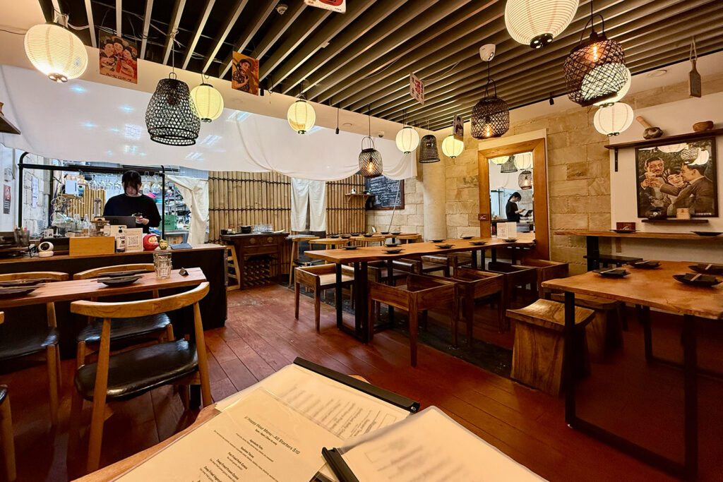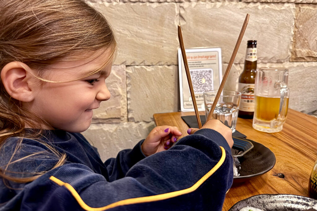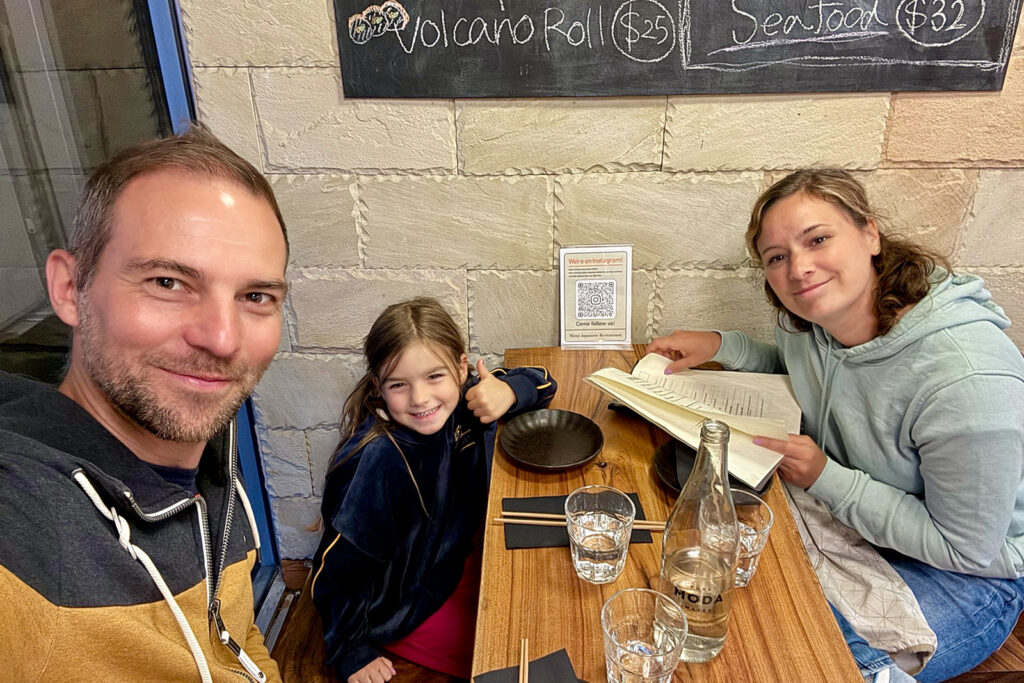 Und weil es schon so spät war, sind wir dann nicht mehr zur Oper, sondern auf direktem Wege zu dem angeblich besten Japaner in der Stadt. Mit einer glatten 5.0 Bewertung und der Ansage, dass es eine der authentischsten japanischen Küchen in Sydney sei, hatten wir entsprechend hohe Erwartungen. Das Restaurant selbst ist ganz klein, 5 Teak-Holztische, hübsch eingerichtet: an der Decke japanische Papierball-Lampions, überall stilvolle Verkleidungen und eine sehr nette Bedienung. Wir bestellen ein paar kleinere Vorspeisen auf gut Glück und zwei japanische Biere. Maila bekommt ihre geliebten Maki mit Gurken und futtert davon ganze 16(!) weg!