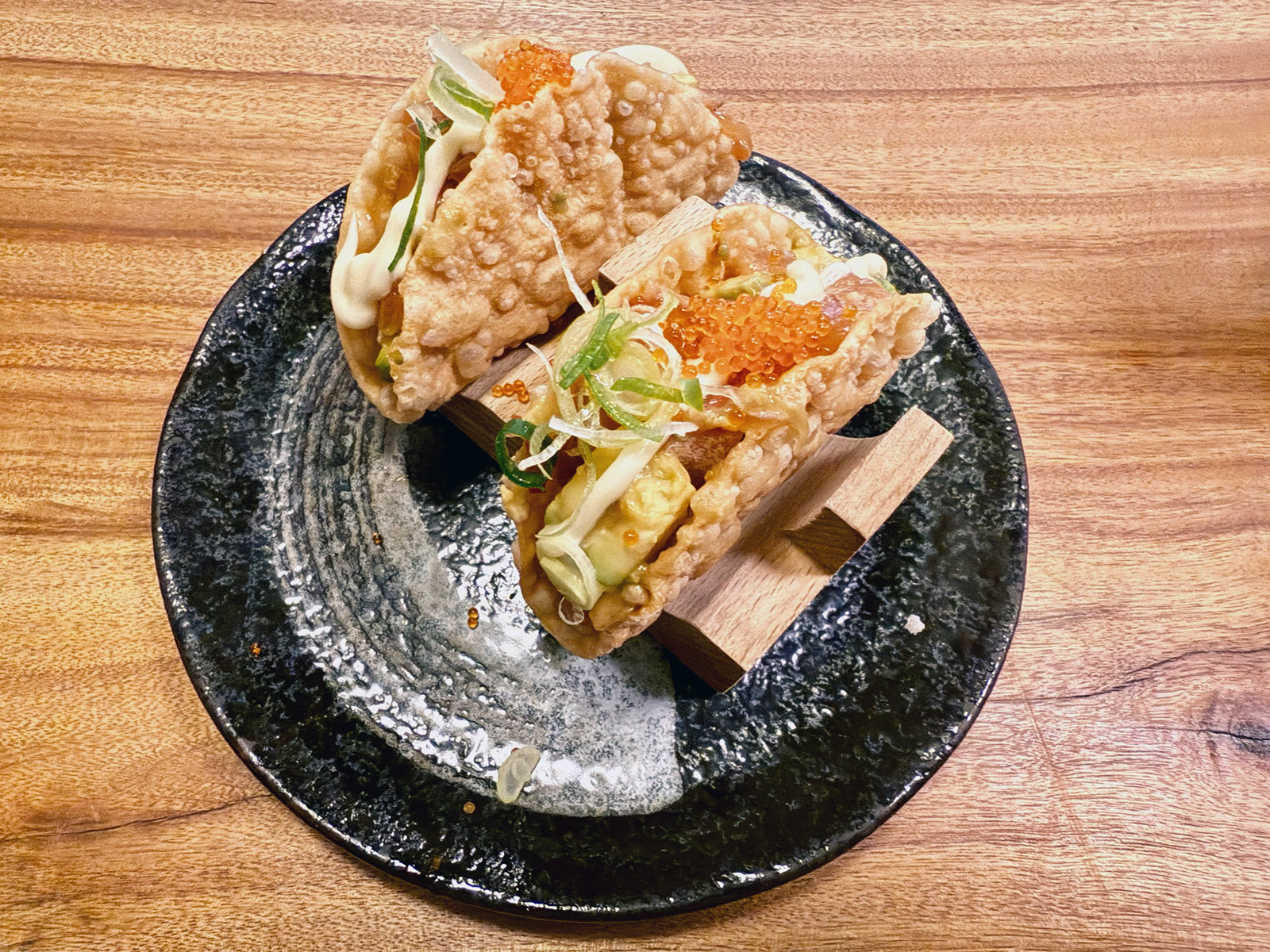 Zunächst kommen zwei Tacos, gefüllt mit Lachs, Thunfisch, Avocado, diversen kleinen Gemüsestückchen und zwei unterschiedlichen Cremes. Und es schmeckt fantastisch! Im Mund entfalten sich nacheinander zwei, drei völlig unterschiedliche Aromen – dezent fruchtig, leichte Säure am Ende. Unglaublich lecker! Ich bestelle direkt nochmal zwei und sage zu Miri, dass dies einer der Fine-Dining-Momente wird, von denen ich dann immer berichten werde. Wie das erste Tuna Tataki in der Zanzibar Bar oder das erste Mal im Sterne-Restaurant Hammers!