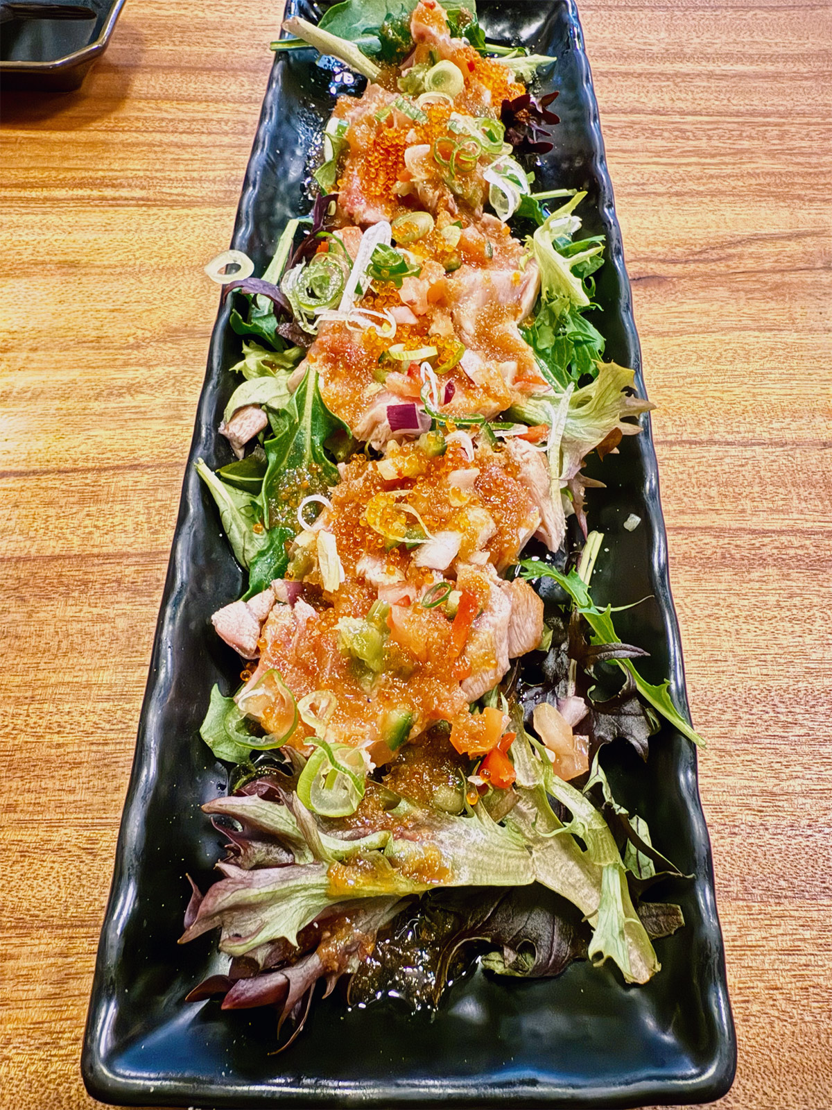 Danach kommt ein Tuna Tataki auf Salat mit einer sensationellen Vinaigrette. Der Tuna zerläuft förmlich auf der Zunge und schmeckt so fein, dass man sich kaum zu kauen traut. Wirklich kein Vergleich zu jeglichen Sushi/Sashimi, die ich bisher gegessen habe. Miri hatte eine Lachs-Avocado-Roll. Und obwohl man ja meinen könnte, dass bei drei Grundzutaten nicht viel anders schmecken kann also üblich, waren diese hier ebenfalls ein Offenbarung. Auch Miri war sehr begeistert! Ein leichter Hauch von Räucherfisch war als Topping eine sehr überraschende Geschmacksnote, die nur ganz kurz im Gaumen blieb. Gerade so, dass man es bemerkte. Es hat aber den Geschmack überhaupt nicht dominiert oder übertüncht. Echt abgefahren.