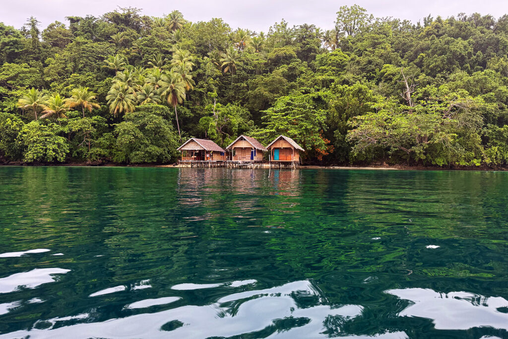 Am Hafen in Waisai erwartete uns dann schon das kleine Langboot, mit dem wir auf unsere kleine Insel Friwin gebracht werden sollten. Aber der Motor ließ sich direkt mal nicht starten. Und während sich der Hafen mehr und mehr leerte, trieben die Freyseles noch immer im Hafenbecken umher. Unter großem Einsatz und unermüdlich riss der gute Mann immer wieder an dem Startseil des Bootmotors. Aber da tat sich nichts. Irgendwann hat er das Ding auseinander gebaut und nach einiger Bastelarbeit sprang er dann wenigstens mal an. Die Freude währte nicht besonders lange. Als wir schließlich auf dem Meer waren ging das Stottern los und der Motor war wieder aus. Und so ging das noch weitere viermal, bis wir endlich auf unserer ersten kleinen Insel Friwin angekommen sind. Sehr hübsch hier auf den ersten Eindruck. Allerdings geht die Sonne schon unter und wir werden wohl erst morgen so richtigen sehen können, wo wir sind.