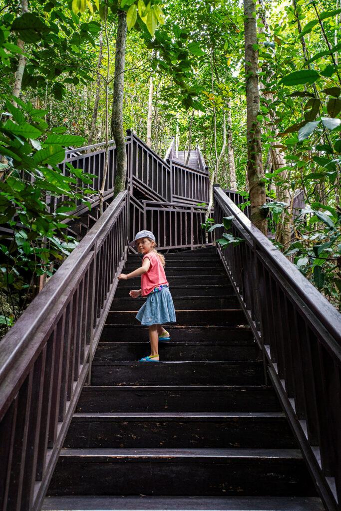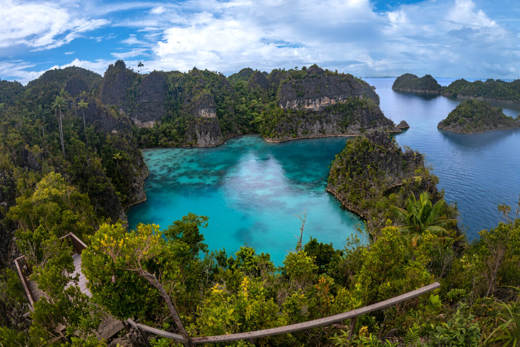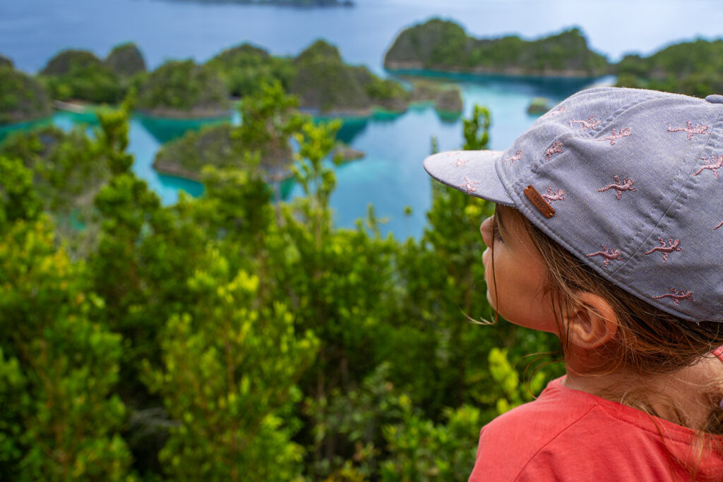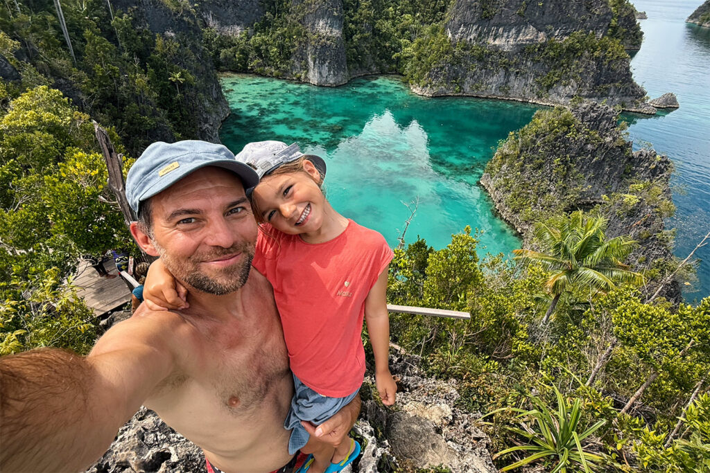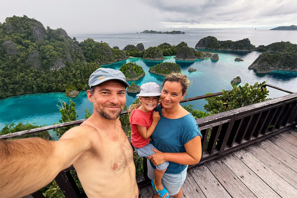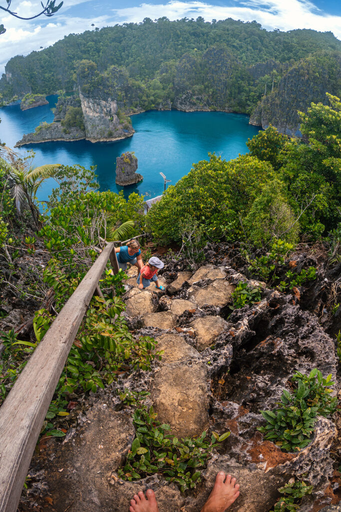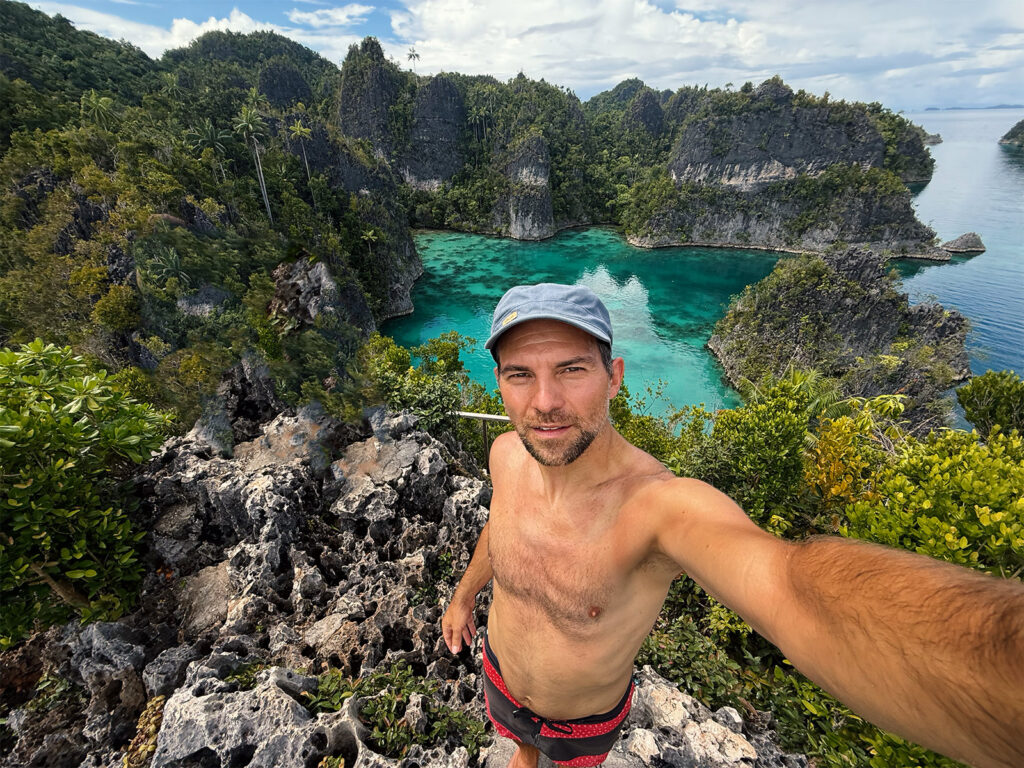 Aber einmal mehr überrascht uns Raja Ampat und wir erwischen tatsächlich ein gutes Zeitfenster um, zumindest die Bootsfahrt trocken auf die nördlich gelegene Insel mit dem Aussichtspunkt und der wunderschönen Karststein-Lagune Piaynemo zu erreichen. 5 Minuten bevor wir in die Lagune einfahren, verdunkeln sich der Himmel aber leider erneut und die ersten Tröpfchen fallen auf uns herab. Wir ziehen schnell unsere Wetsuits an, damit wir für später wenigstens trockene Wechselkleidung haben, sollten wir jetzt einmal komplett eingeduscht werden. Die gute Sache daran ist, dass außer uns nur ein einziges Boot vor Ort ist. Und die drei Gäste sitzen unter ihrem Dach. Wir beschließen also die etwas über 350 Treppen durch wirklich schönen, dicht bewachsenen, alten Dschungel hinauf zur Aussichtsplattform zu steigen. Da man eh im Wald läuft bekommt man hier eher weniger vom Regen ab. Oben angekommen blieben 2-3 Minuten, bevor es dann wieder angefangen hat. Wir haben uns dann oben unter einem kleinen Bäumchen einen halbwegs trockenen Platz gesucht und darauf vertraut, dass sich das Wetter abermals schnell und abrupt ändert.