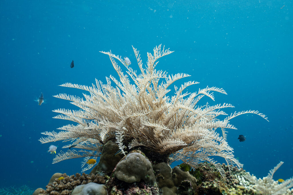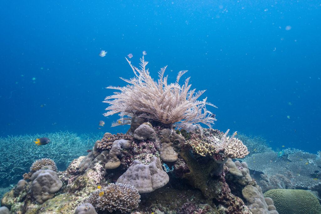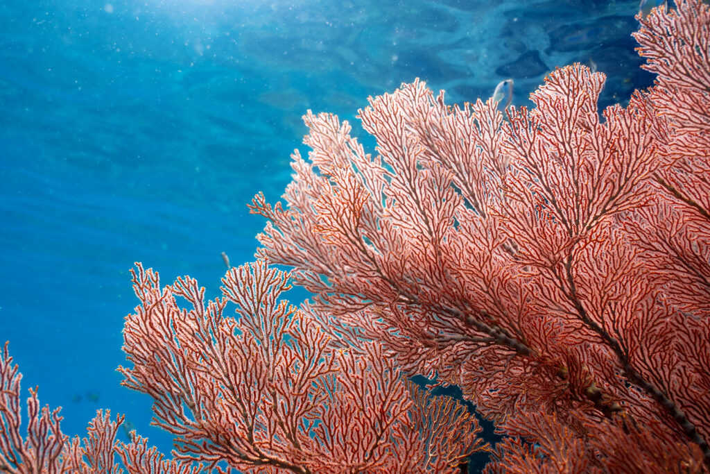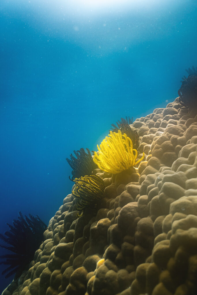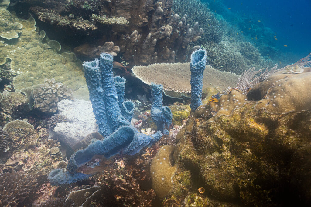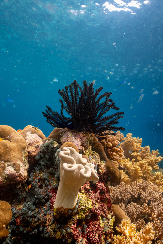 Nachdem wir unten in der Lagune noch etwas gegessen haben, ging es dann weiter zu der kleinen Insel Rufus, mit ihrer innenliegenden Lagune. Am Außen-Riff sind wir ein klein wenig geschnorchelt. Und auch hier muss ich sagen, dass die Korallen gesund und intakt aussahen! An den Wänden haben sich zahlreiche Schwämme und Fächer-Korallen angesiedelt, die in der Strömung ständig leicht in Bewegung waren. Mit ihren feinen federähnlichen Trieben, die mit kleinsten Härchen besetzt sind, wehten die Fächer Sanftmut der Strömung hin und her. Man hätte stundenlang zuschauen können. Da die Korallen in relativ geringer Tiefe von ein bis zwei Metern wachsen, konnte man mit bloßen Auge und ohne zusätzliches Kunstlicht schon die tollen Farben sehen.